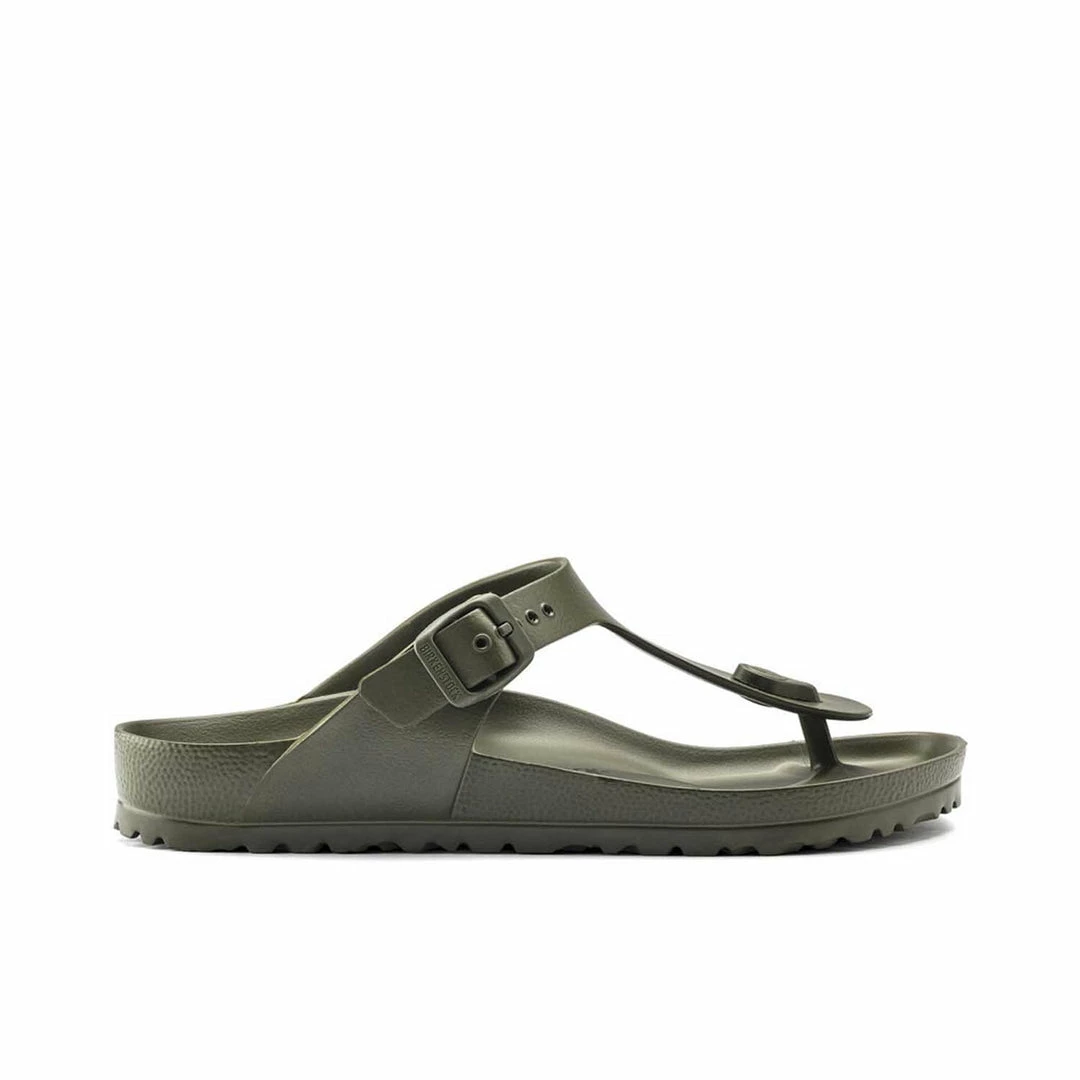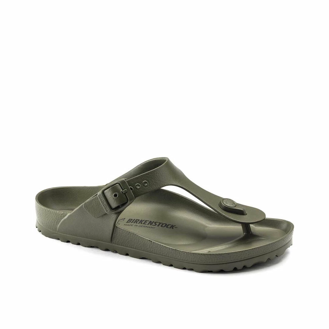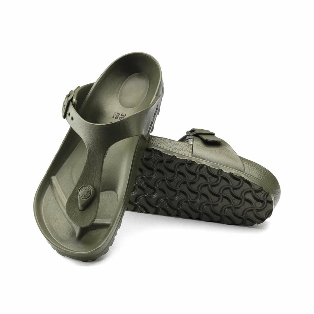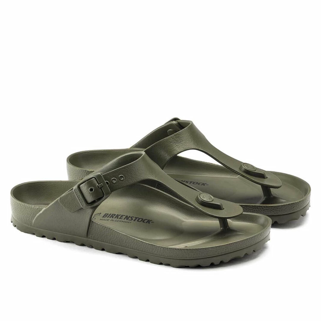 BIRKENSTOCK Gizeh is the classic thong sandal. Modeled on the cork original, this sandal is made from ultra lightweight and highly flexible EVA. These colorful sandals are shock-absorbent, waterproof, and skin-friendly.
