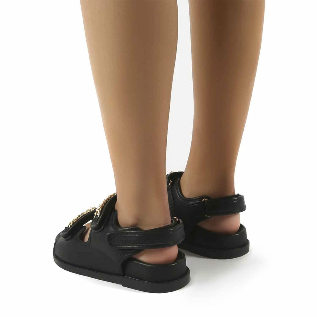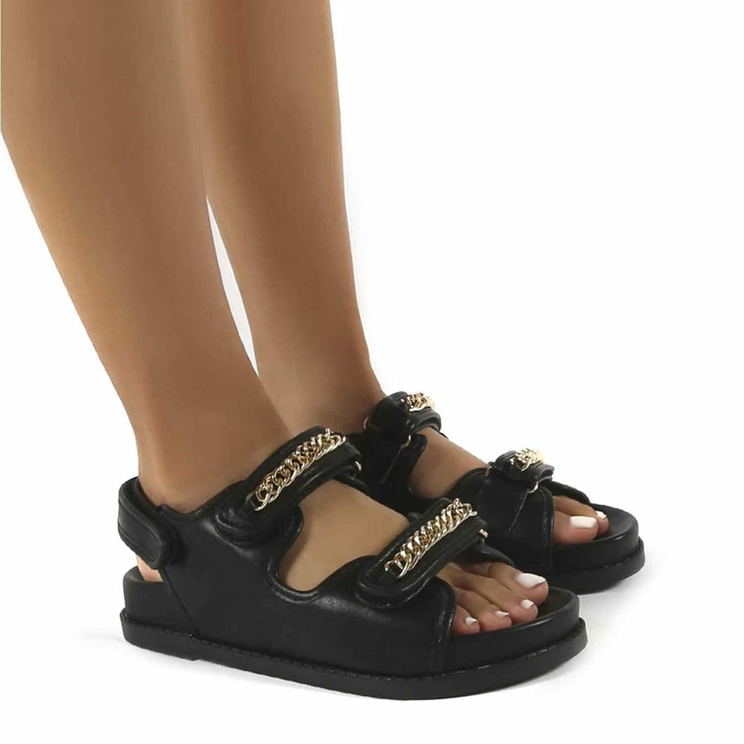 Ellis Black features two upper self fasten, chain detailed straps and one self fasten ankle strap. The Chain details on these sandals will add an edge to any summer look.Â