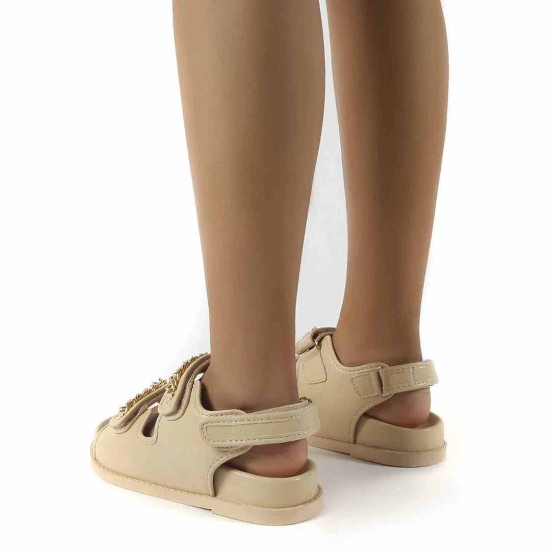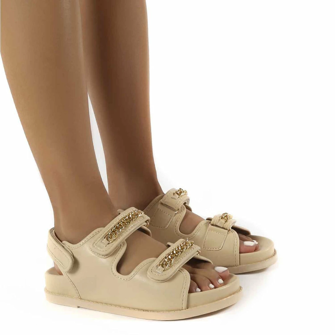 Ellis Nude features two upper self fasten, chain detailed straps and one self fasten ankle strap. The Chain details on these sandals will add an edge to any summer look.