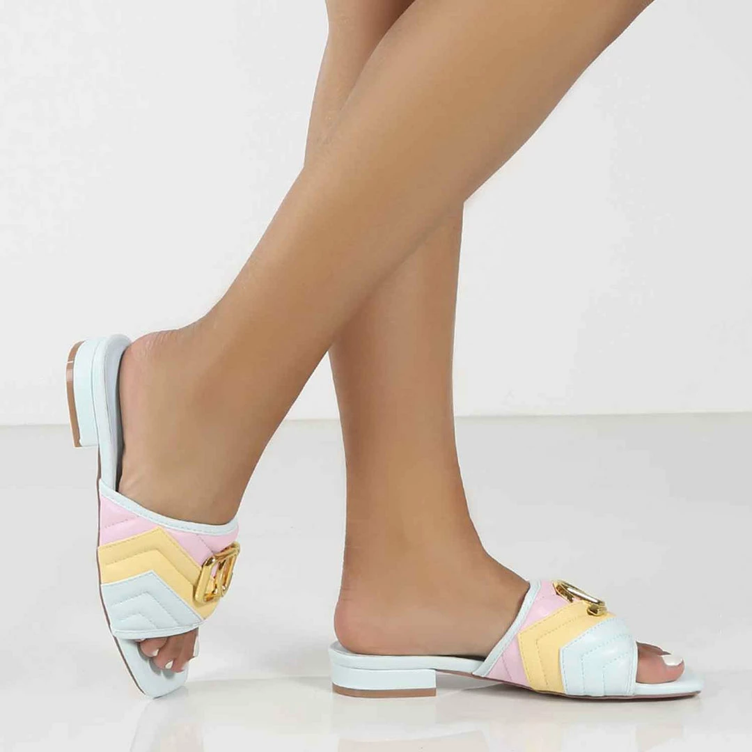 Harrie features a padded single foot strap, flat sole and metal monogram detail. This shoe is perfect for all your summer plans!