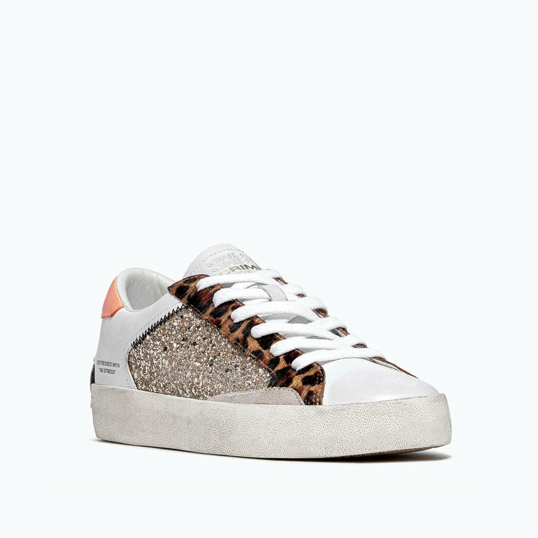 Low Top Distressed Sneakers for women in Italian top quality used-effect leather, glitter and animalier print pony skin. Flat cotton laces. DESTRESSED WITH “NO STRESS” lettering on outer side. Peach pink leather heel. White suede side details. Rubber sole. The leather patch with micro studs at the sole back gives the shoe a non-conventional look.