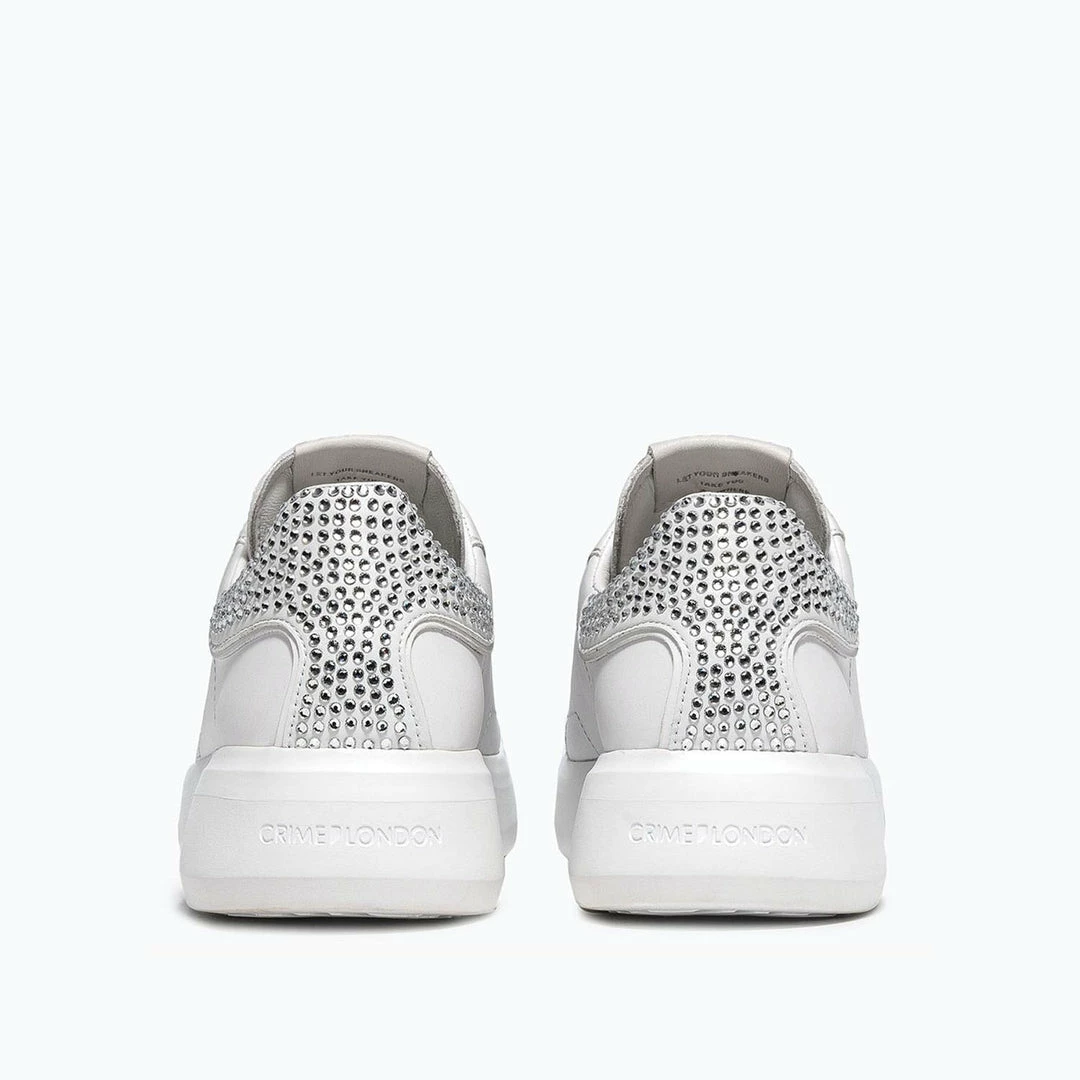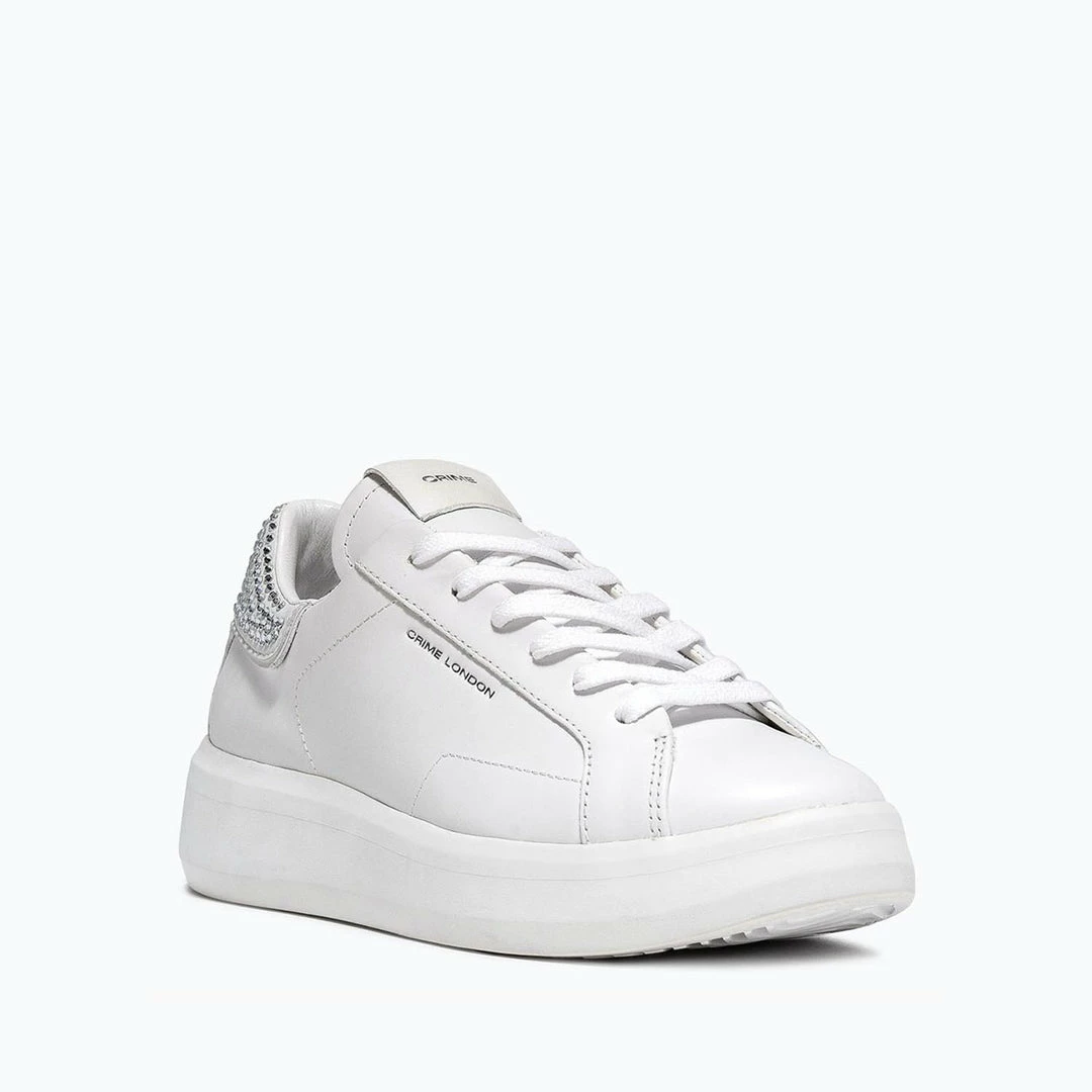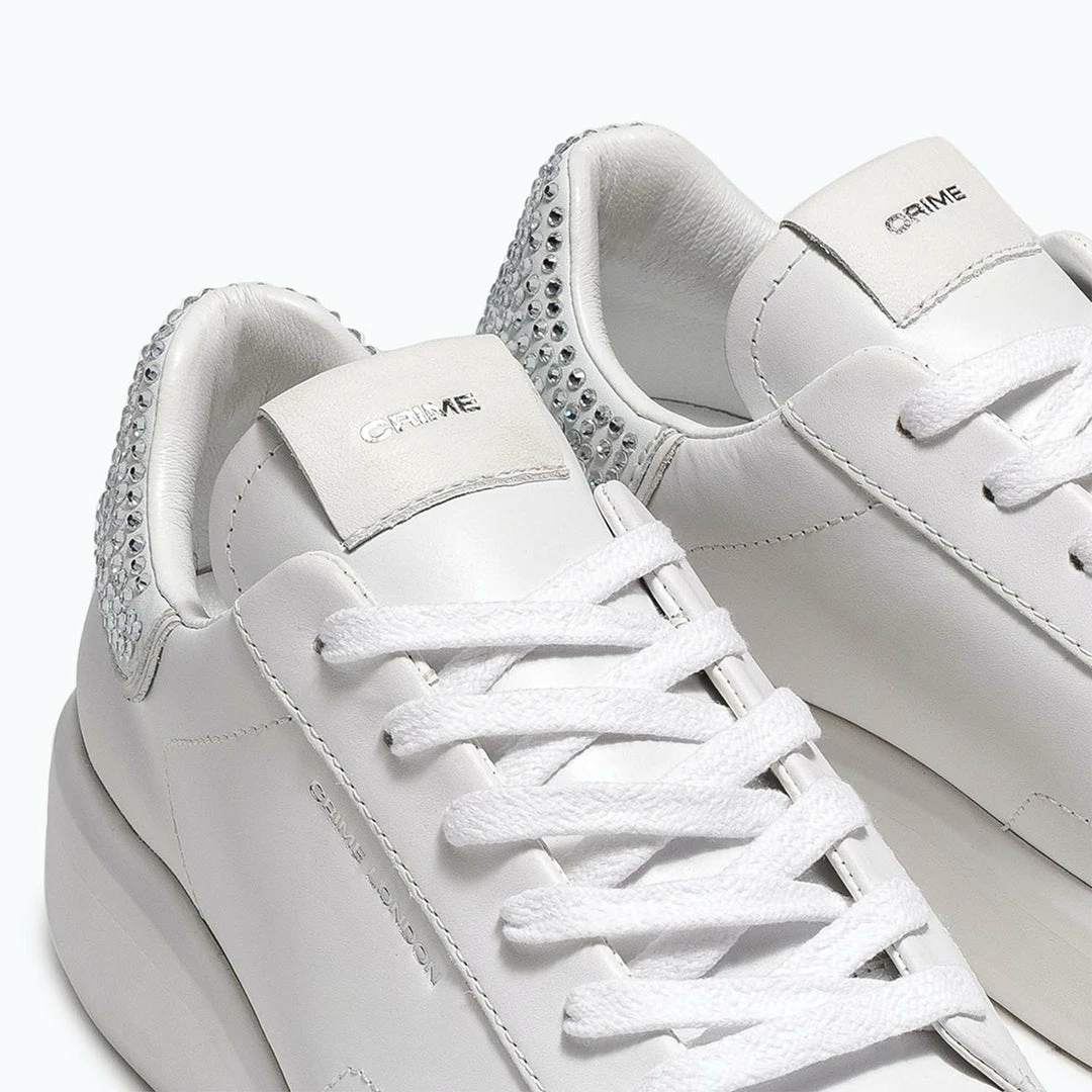Low Top Level Up Sneakers for women in top quality Italian leather. Crime London label at the tongue. Flat cotton laces. Crystal-covered heel. The bulky sole in rubber gives a dynamic effect to the minimal look of the shoe.