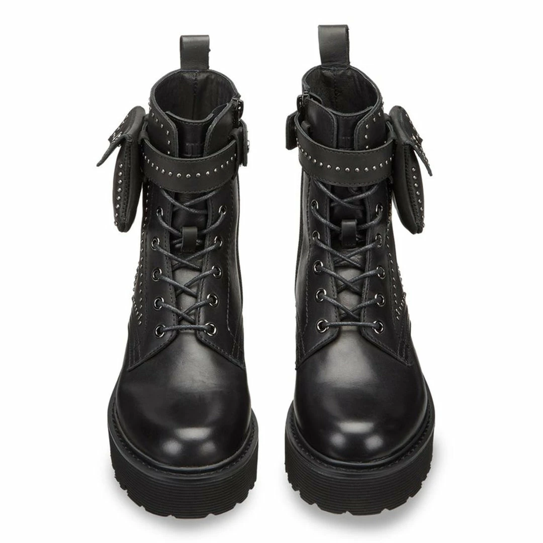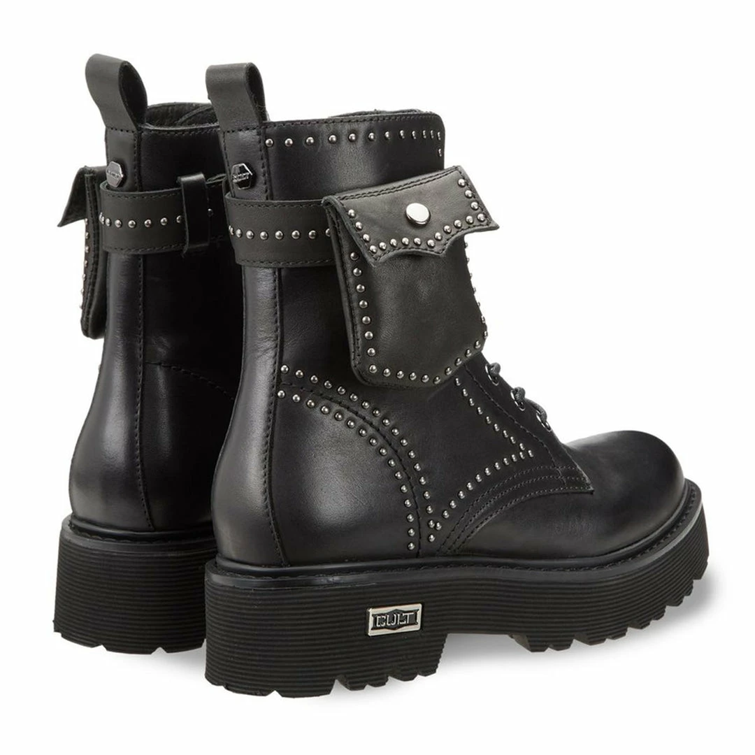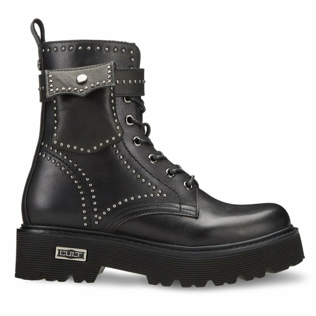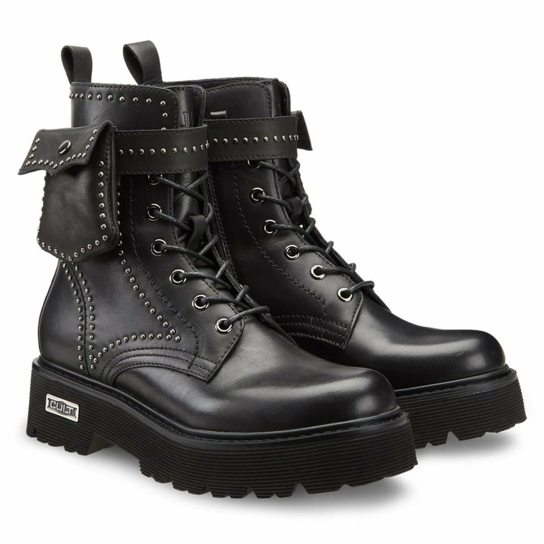 Comfortable but without renouncing to the rock soul the lace-up boots signed by Cult for this winter. A timeless model of leather ankle boots with metal eyelets, enriched with small pouches on the leg, a logo plaque on the rubber sole and a back puller. To wear with jeans, trousers or short skirts.