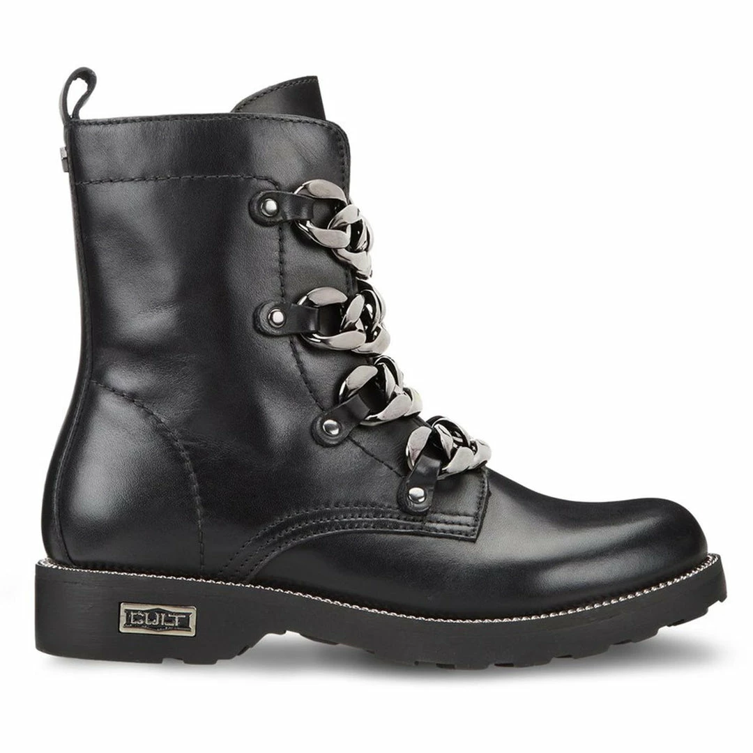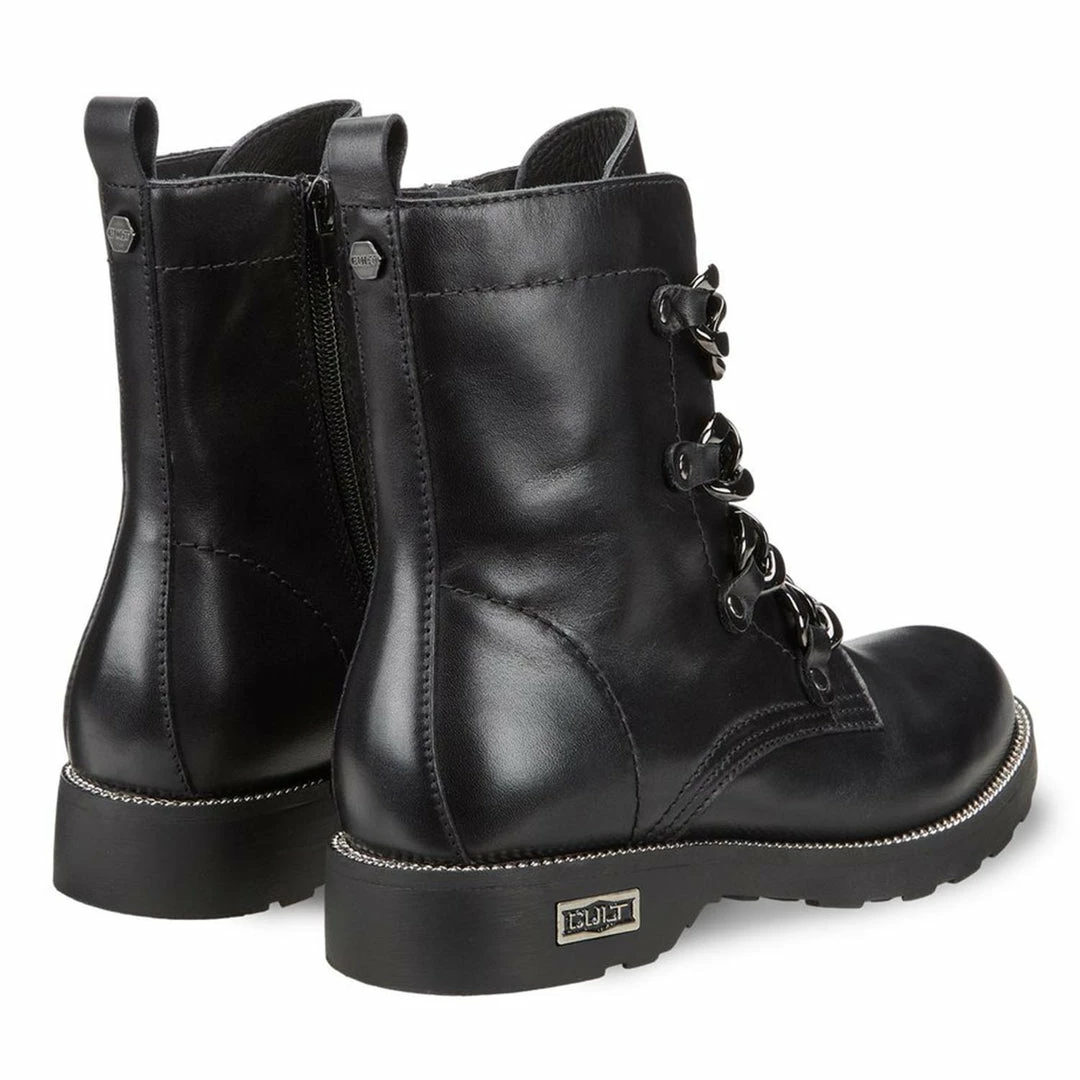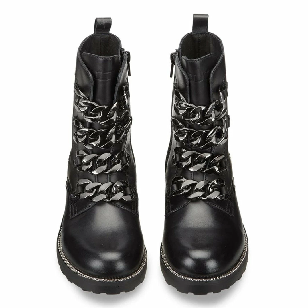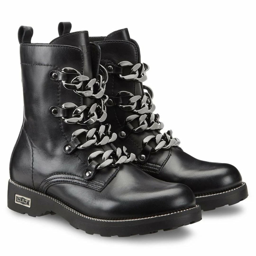 Comfortable but without giving up the rock soul, the Cult ankle boots for this winter. A timeless model of leather ankle boots, enriched with maxi chains instead of laces, logo plate on the rubber sole and rear puller, zip closure. To wear with jeans, trousers or short skirts.