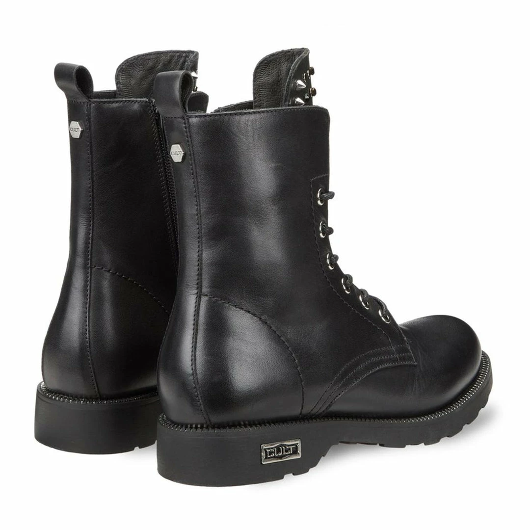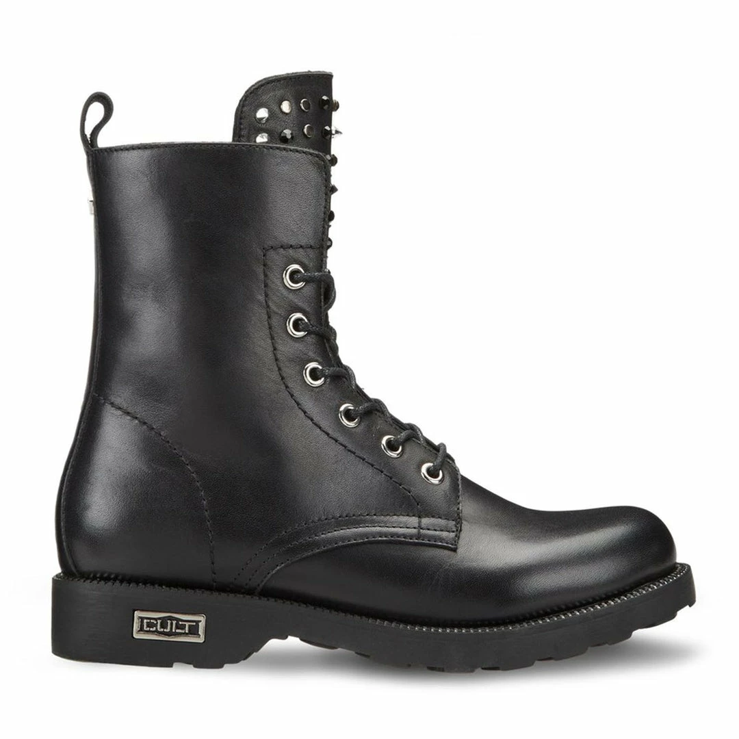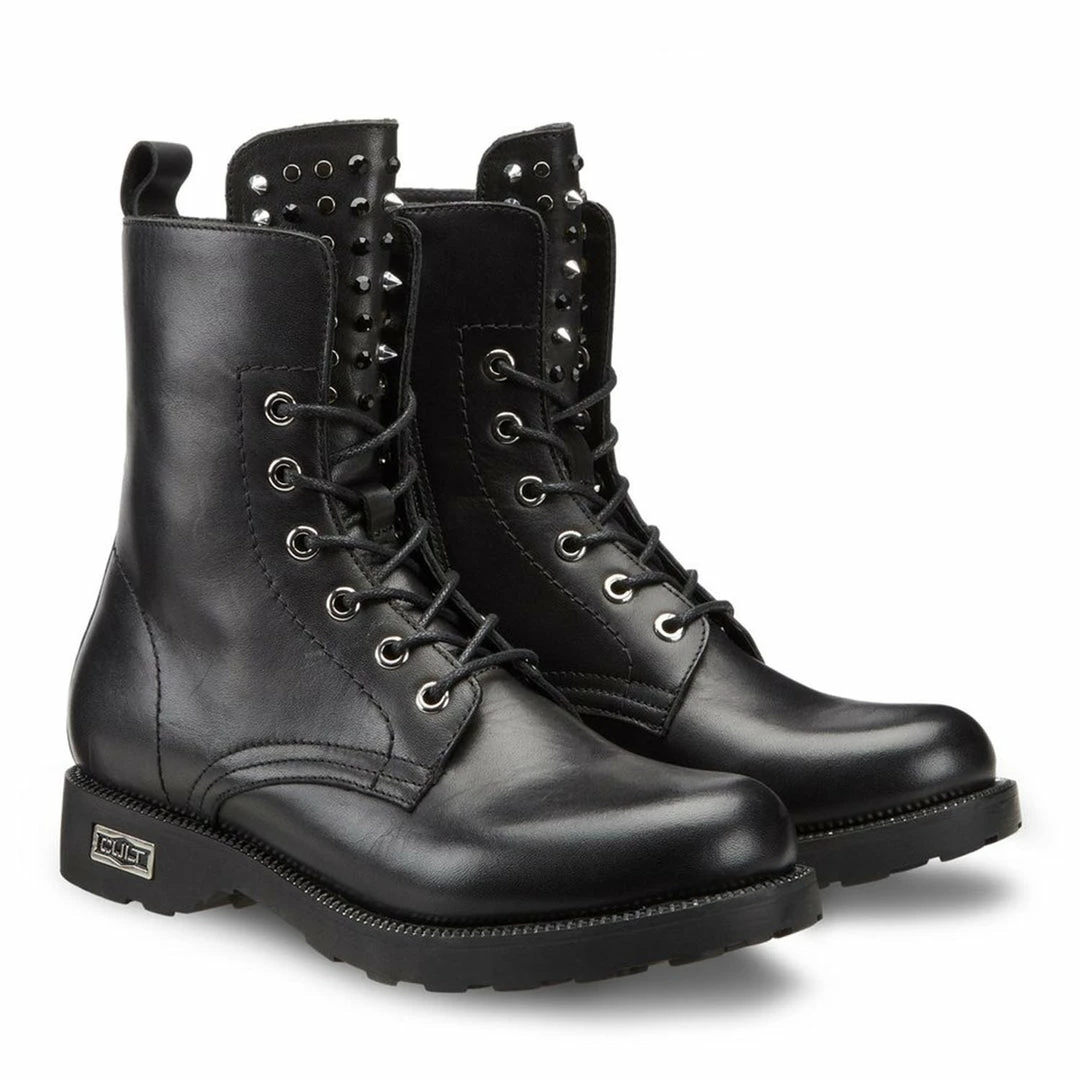 Comfortable but without giving up the rock soul, the lace-up boots designed by Cult for this winter. A timeless model of leather ankle boots, with metal eyelets, tongue embellished with studs, logo plate on the rubber sole and rear puller. To wear with jeans, trousers or short skirts.