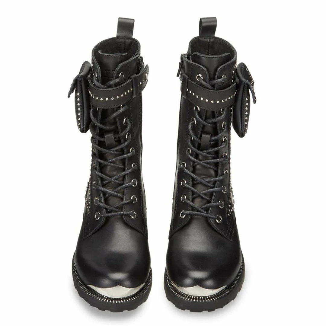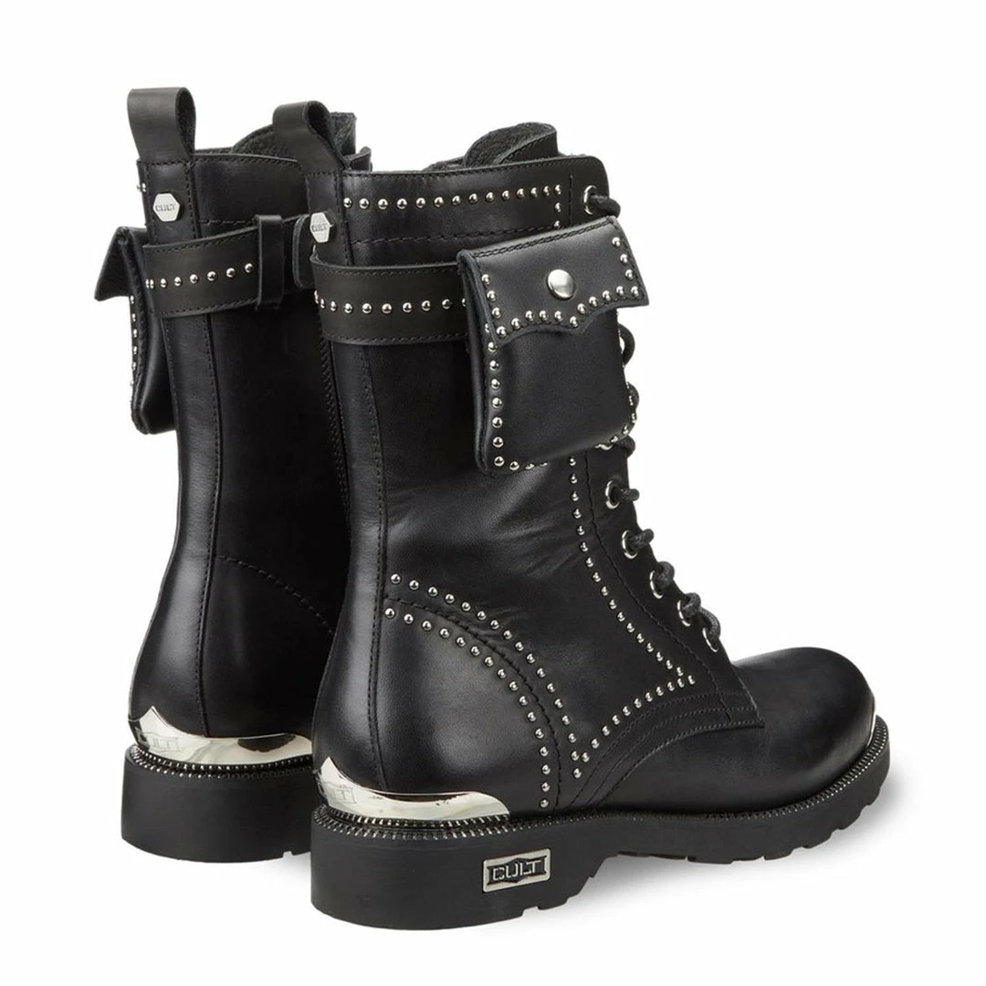 Comfortable but without renouncing to the rock soul the lace-up boots signed by Cult for this winter. A timeless model of leather ankle boots with metal eyelets, enriched with small pouches on the leg, a logo plaque on the rubber sole and a back puller. To wear with jeans, trousers or short skirts.