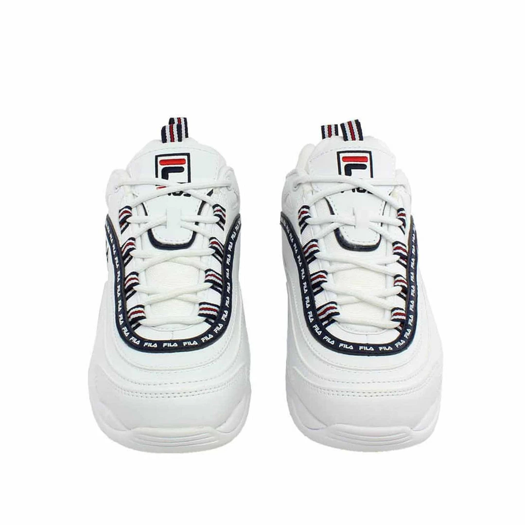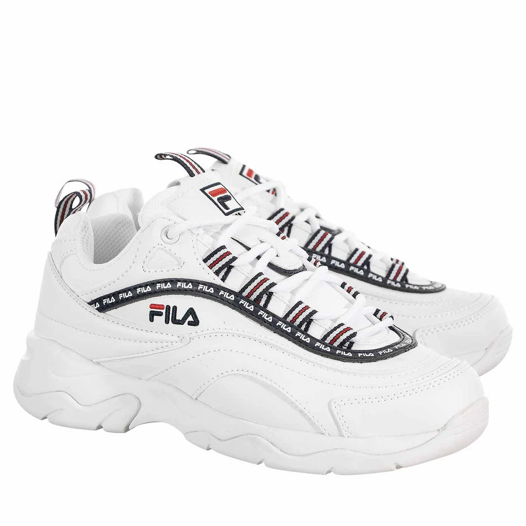 The FILA Ray Repeat has 90s vibes and a chunky profile. They also have a synthetic upper, rope laces, wraparound FILA taping detail, pull tabs, and a thick rubber sole.