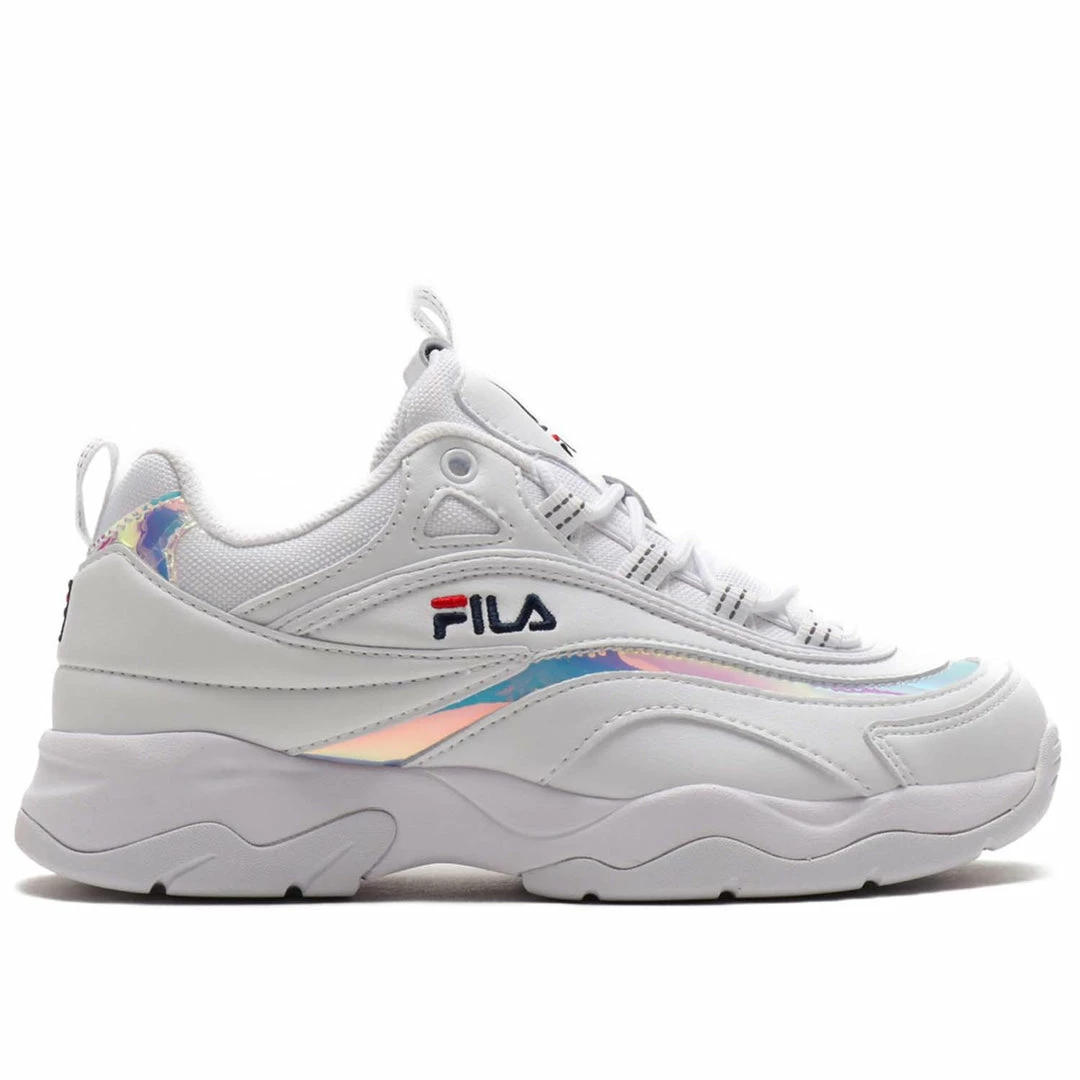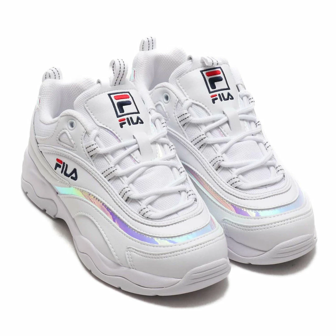 At once old-school and of-the-moment, these Fila sneakers feature touches of holographic trim that add just the right amount of disruption to the optic-white silhouette.