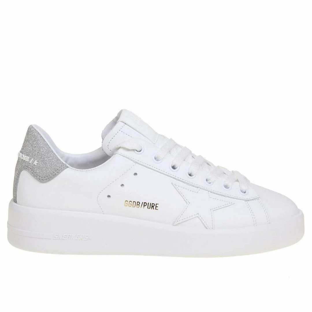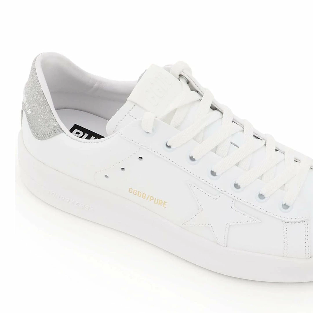 PURESTAR leather sneakers by Golden Goose with tone-on-tone side star, silver glitter heel tab with 3D logo, painted metal eyelets and side perforations. Logo on the tongue and side. Fabric and leather lining, removable insole, cushioned rubber sole.