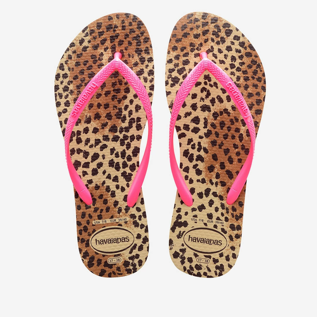 Havaianas Slim Animal Floral flip-flops is sweet on the eyes! The exuberant print on the Slim model is a knockout, and the metallic straps are the ultimate modern statement.