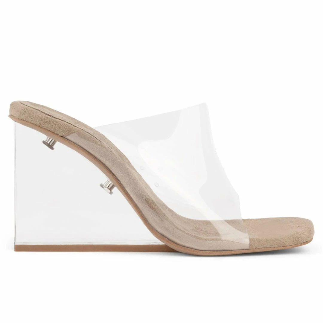A right-angled wedge clears the runway for a beguilingly see-through mule crafted with an open toe and a supersoft microsuede footbed.