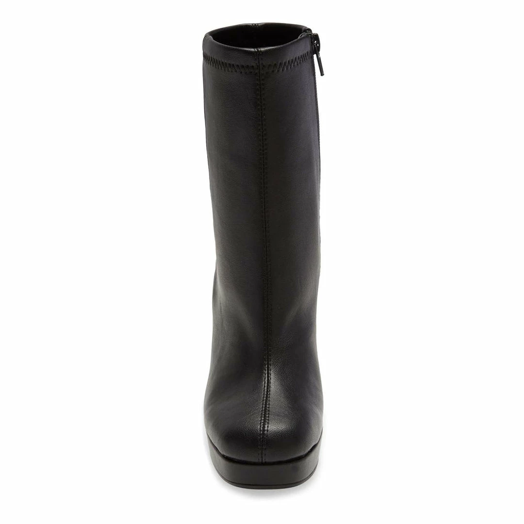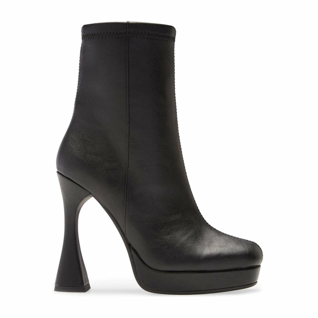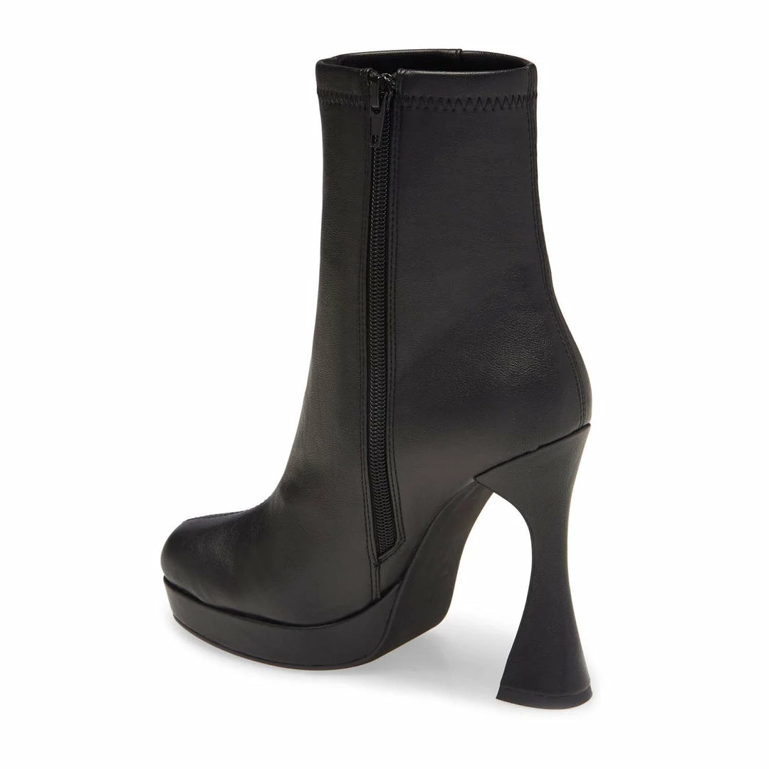 A thoroughly modern flared heel and a chunky platform balances a chic sock-shaft bootie crafted from smooth faux leather.