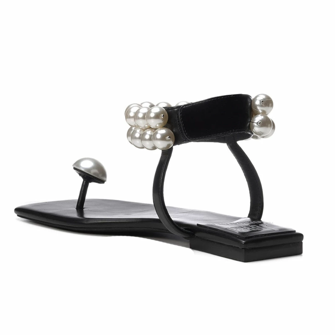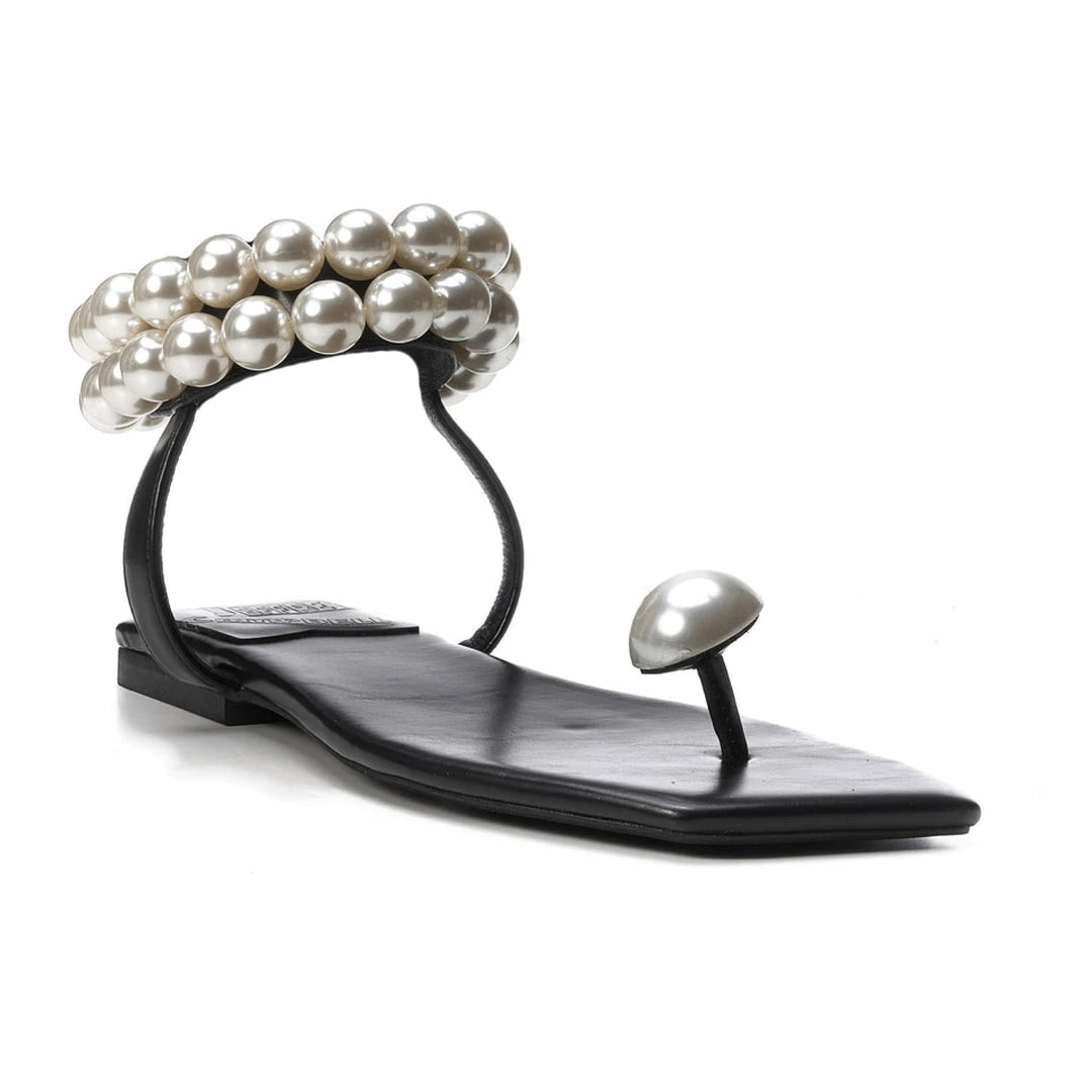 Make an unforgettable entrance in this stunning sandal that has a band of imitation pearls circling the ankle strap and a completely unexpected toe grip.