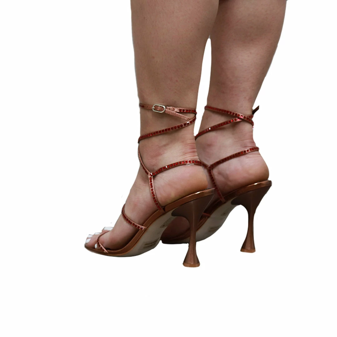 A sculptural heel elevates this strappy sandal with glinting metallic studs on the straps and a square toe.