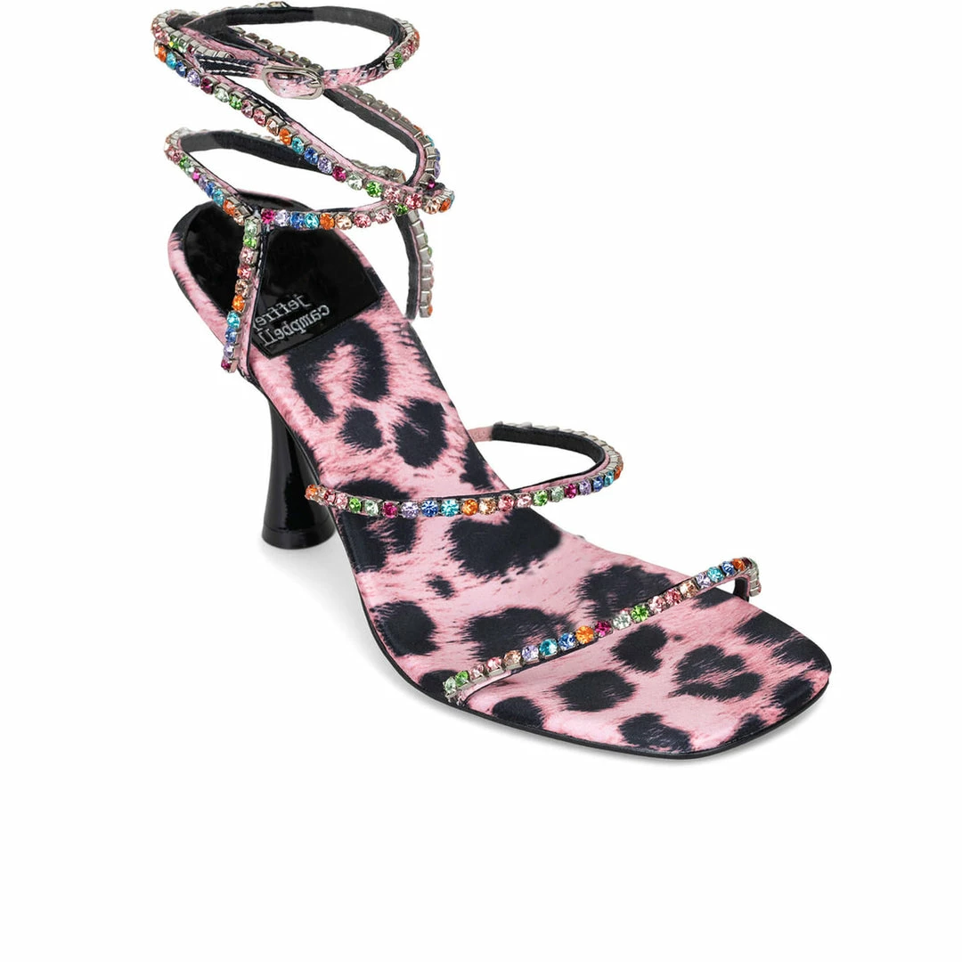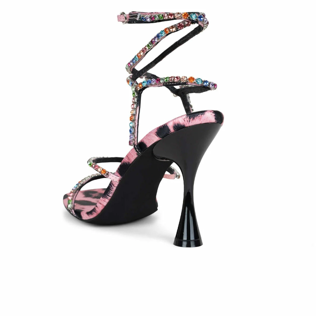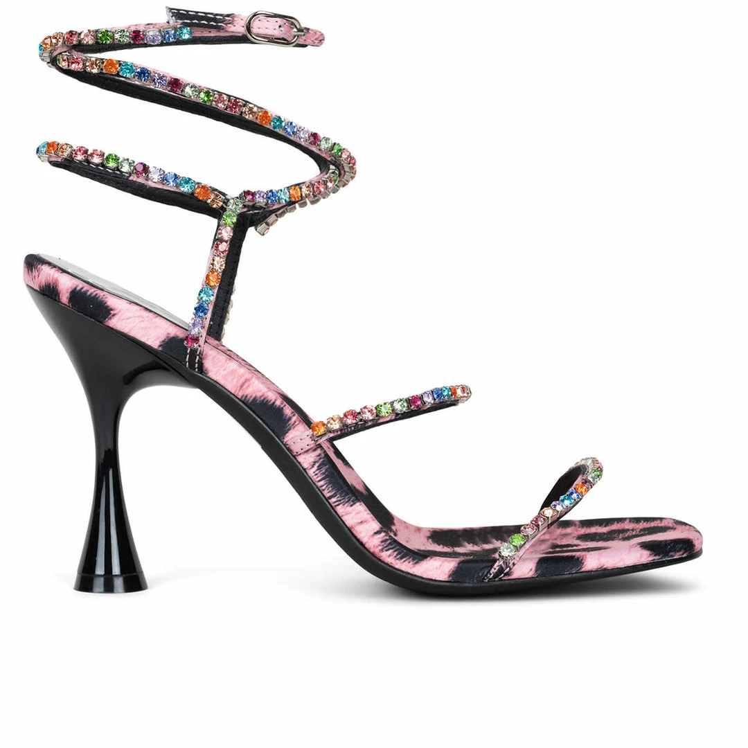 A sculptural heel elevates this strappy sandal with glinting metallic studs on the straps and a square toe.