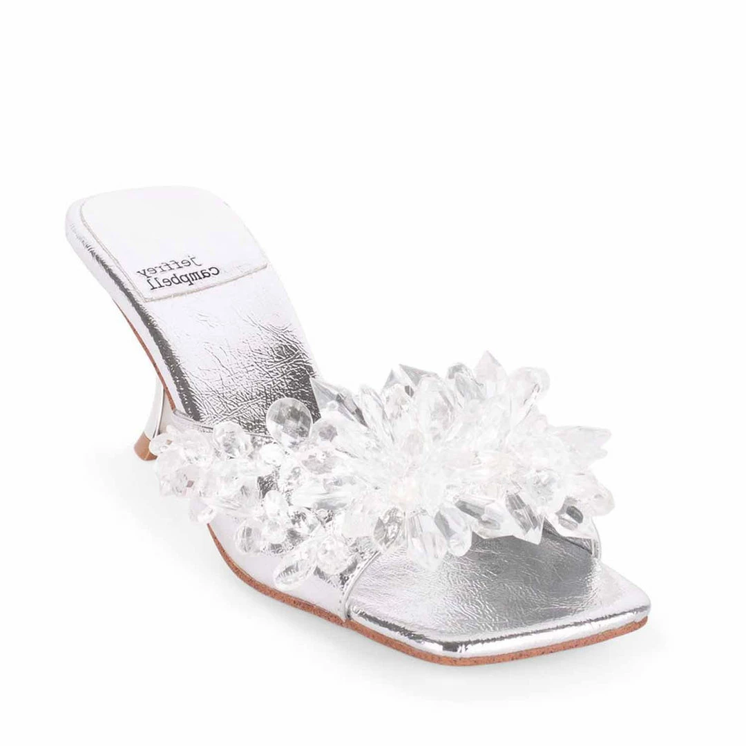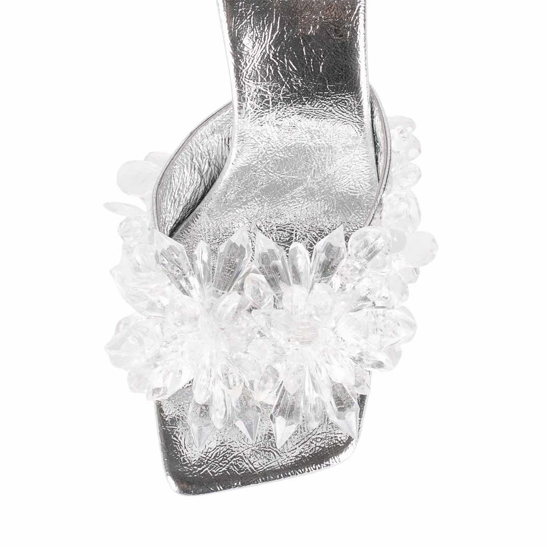 Square-toe heeled sandal with beaded design.