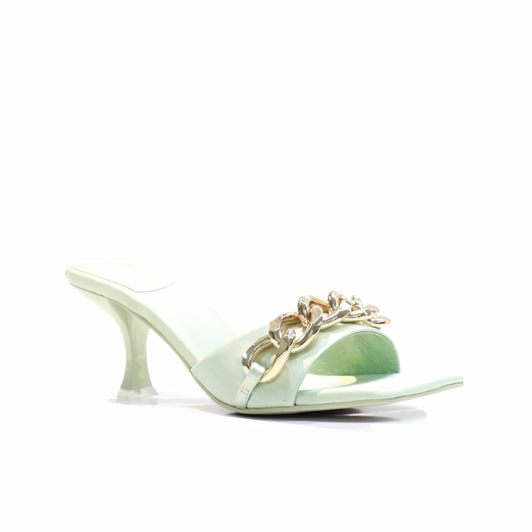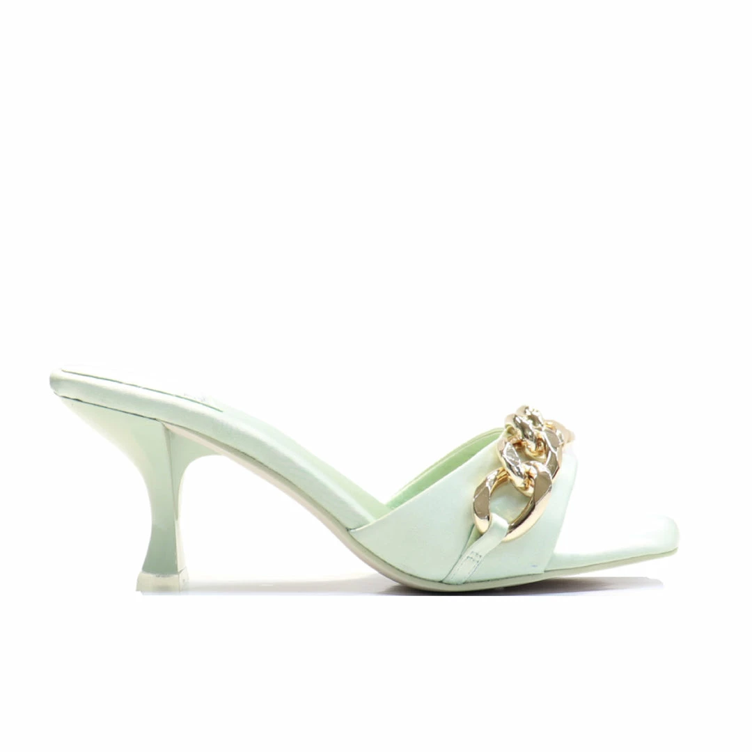 Square-toe heeled sandal with chain.