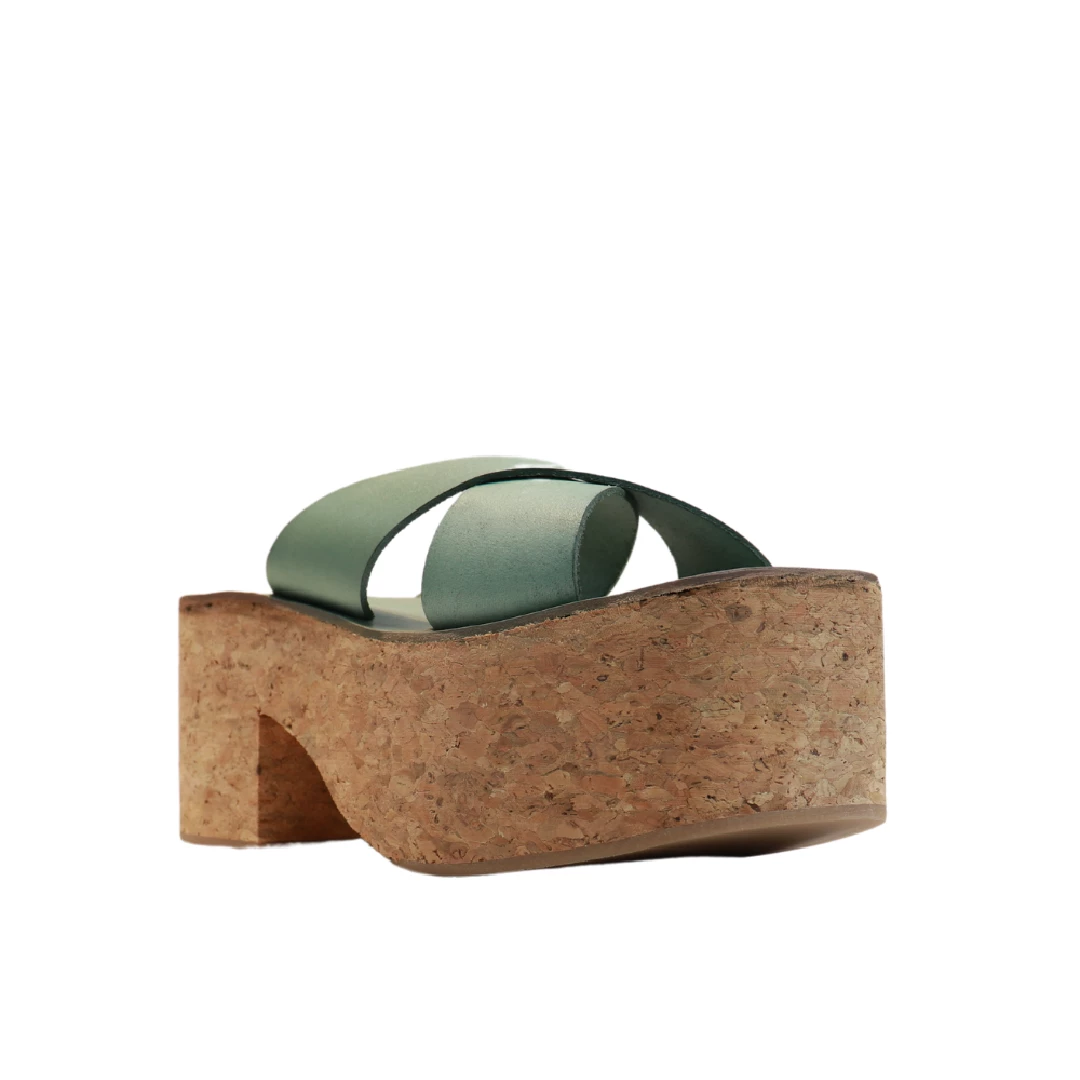 AÂ chunky cork platform and block heel lift a striking slide sandal with smooth leather straps that cross at the vamp.