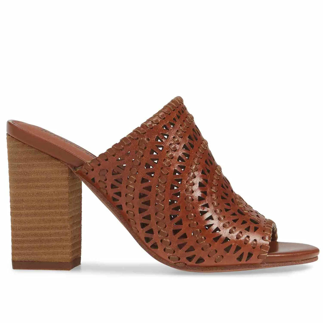 Perforated geo designs and whipstitched trim bring rich detail to a mule sandal elevated with a blocky stacked heel