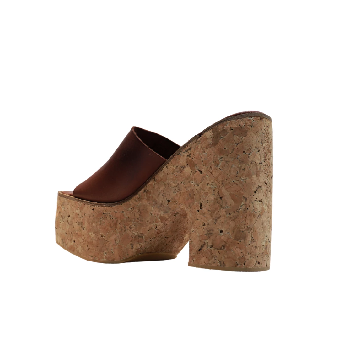 A smooth leather upper contrasts the earthy cork platform and block heel of a ’70s-inspired slide finished with an angular toe.