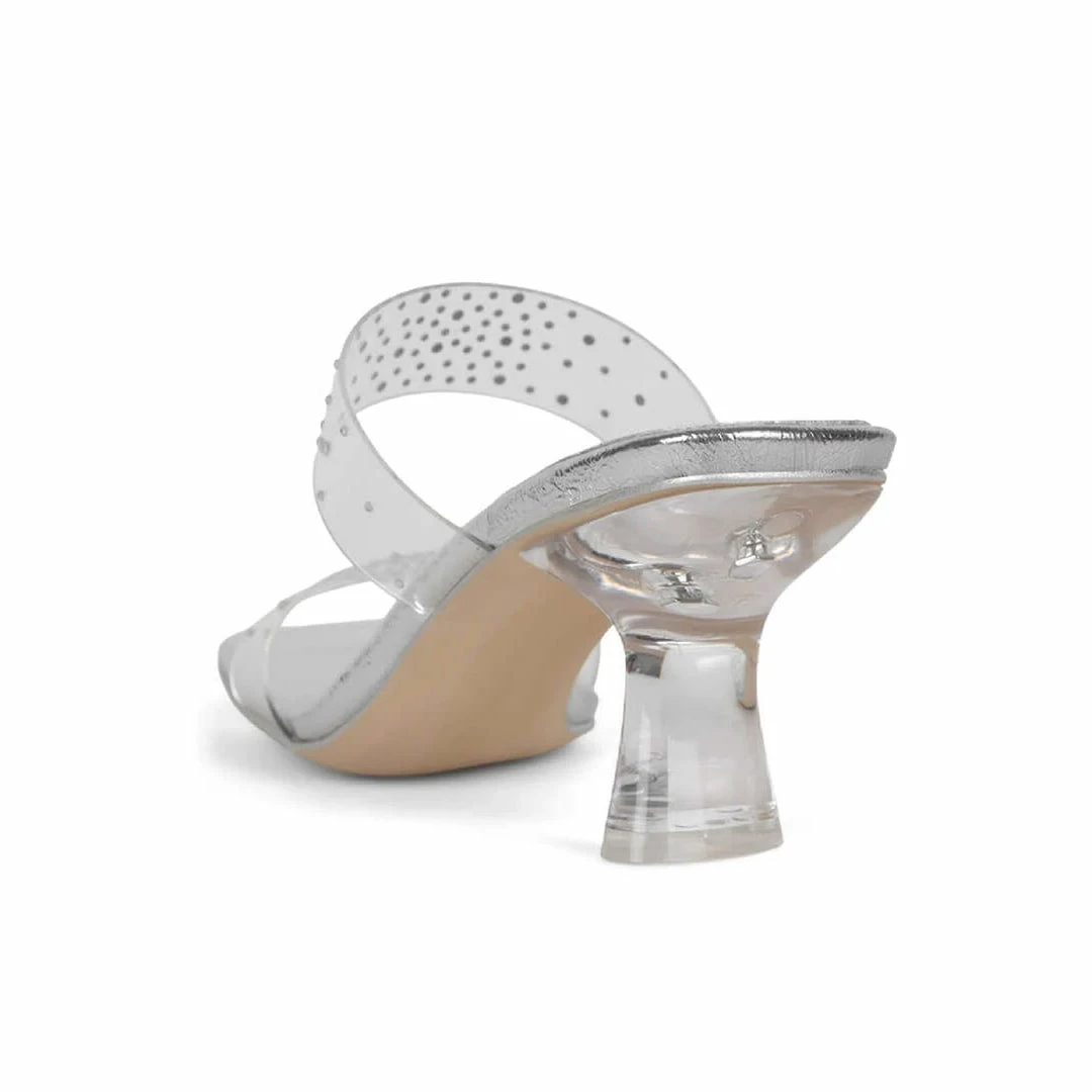 Square-toe sandal with embellished vinyl straps and lucite heel