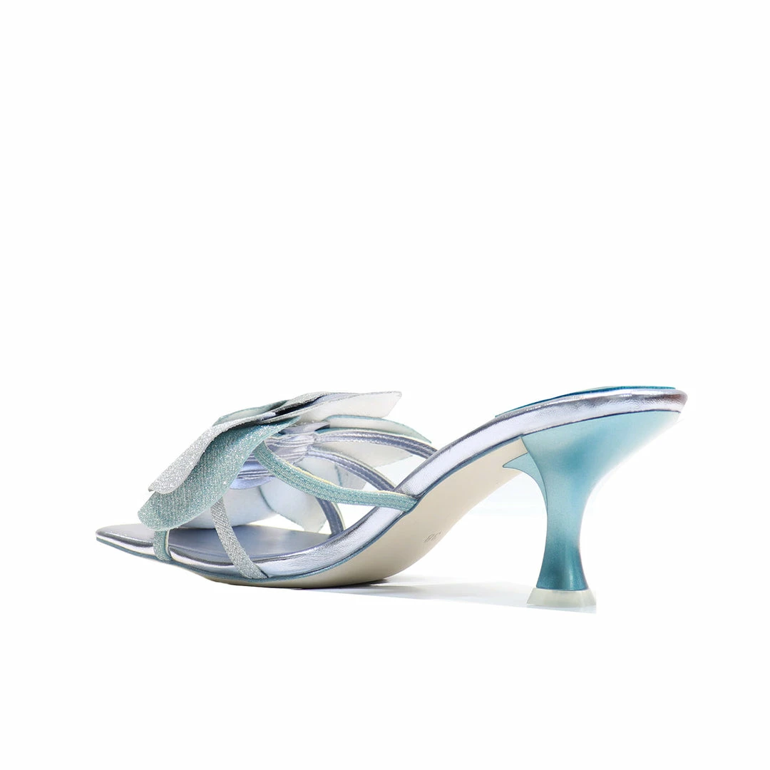 Add beaming style to your eveningwear in this high-shine slide sandal with a square toe, kitten heel and floral applique.