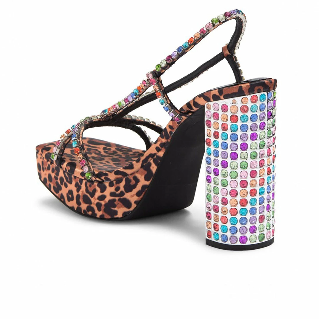 Glittering embellishments outline the straps and heel of this party-ready platform sandal finished with a square toe.