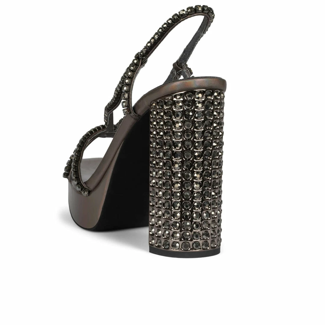 Glittering embellishments outline the straps and heel of this party-ready platform sandal finished with a square toe.