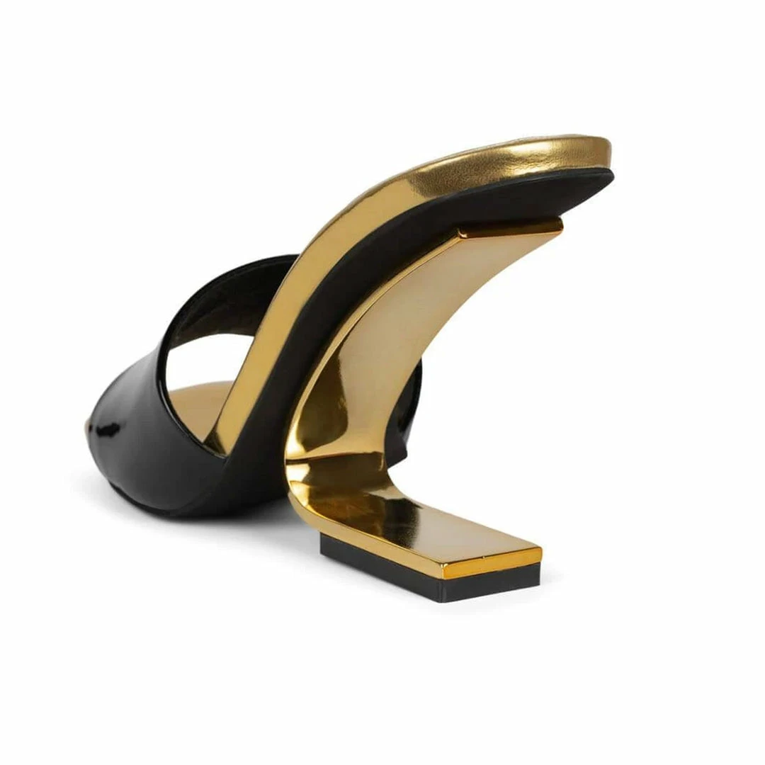 Defy gravity in this stunning architectural sandal lifted on a cantilevered heel and finished with a gleaming patent leather toe strap and metallic gold lining.