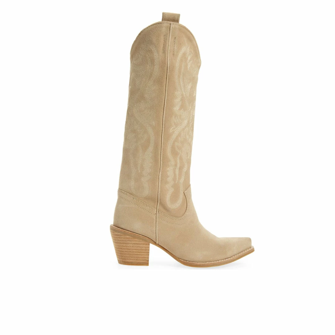 Classic decorative stitching details a timeless Western boot with a curved topline and chunky stacked heel.