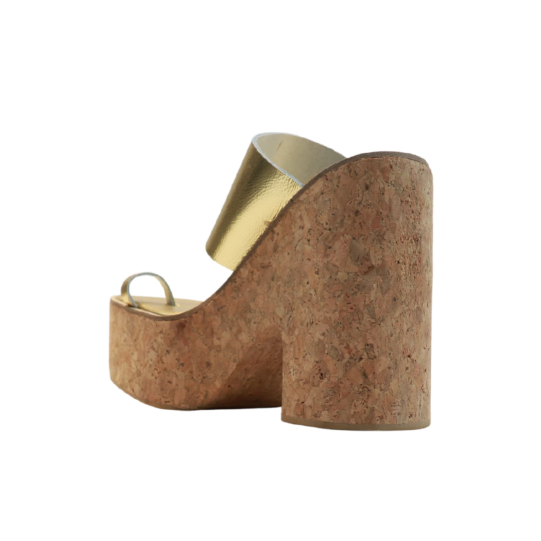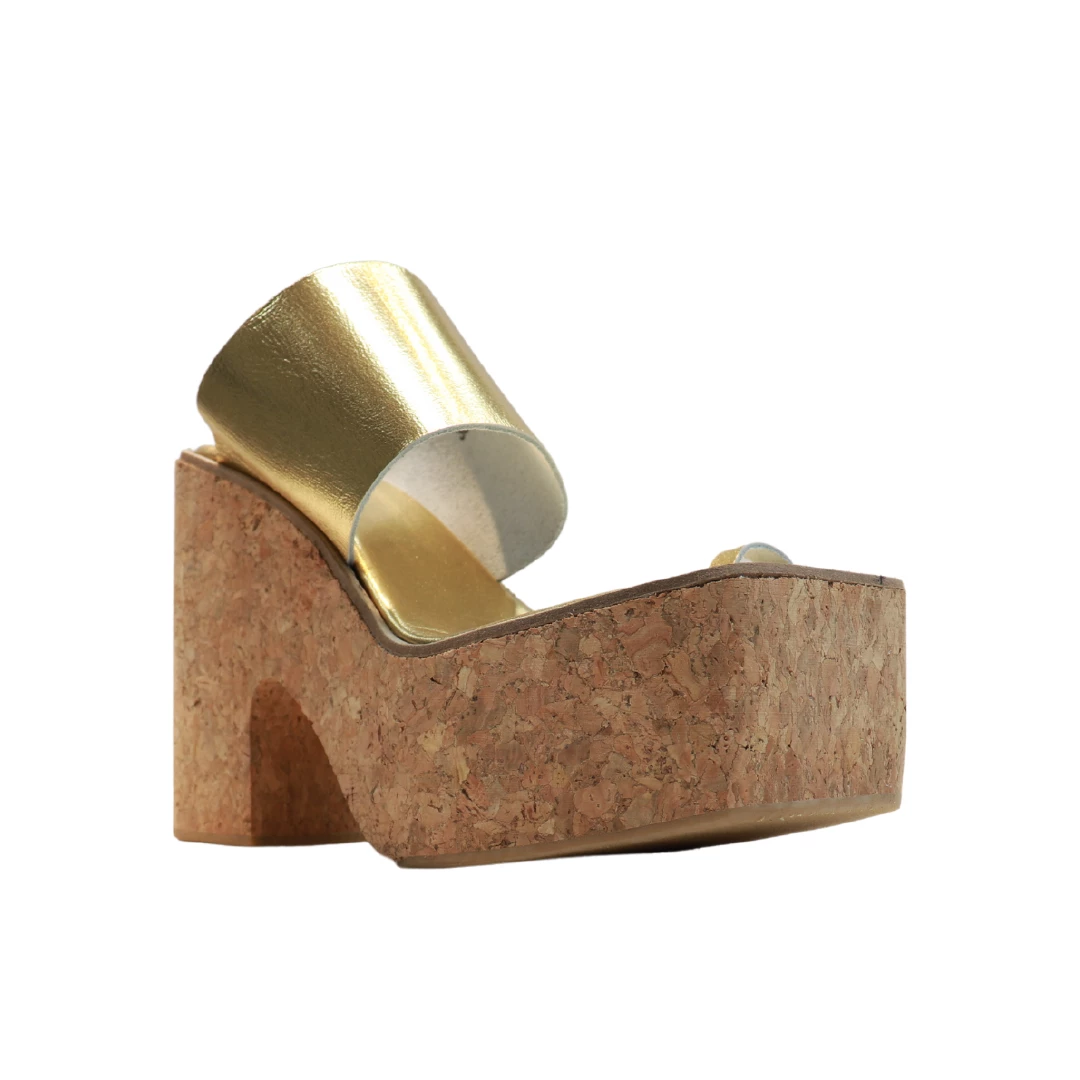 AÂ chunky cork platform and block heel lift a striking slide sandal with smooth leather straps that cross at the vamp.