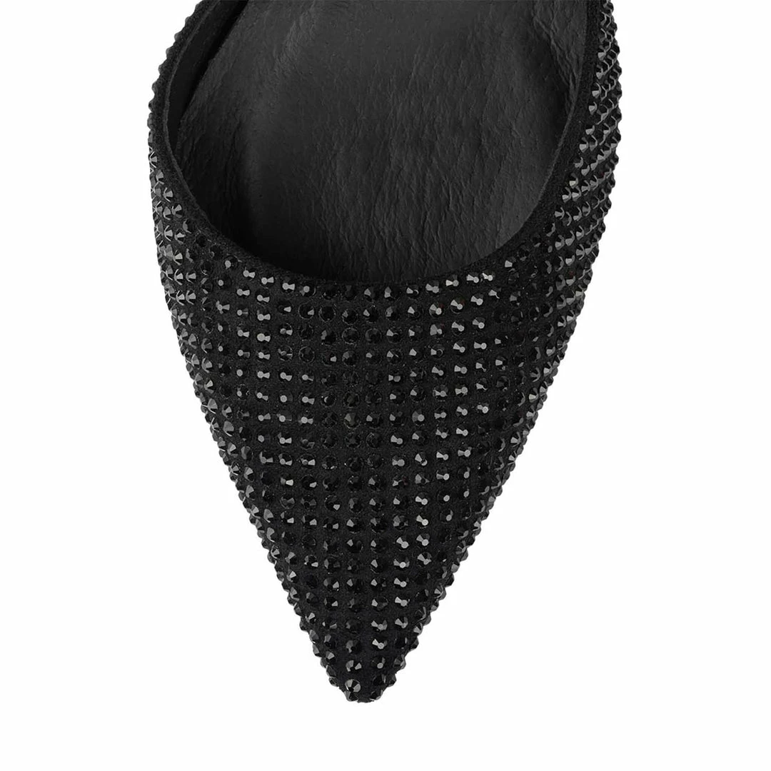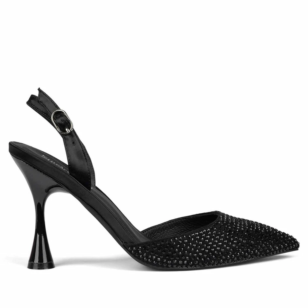 Jeweled slingback pump with trumpet heel.