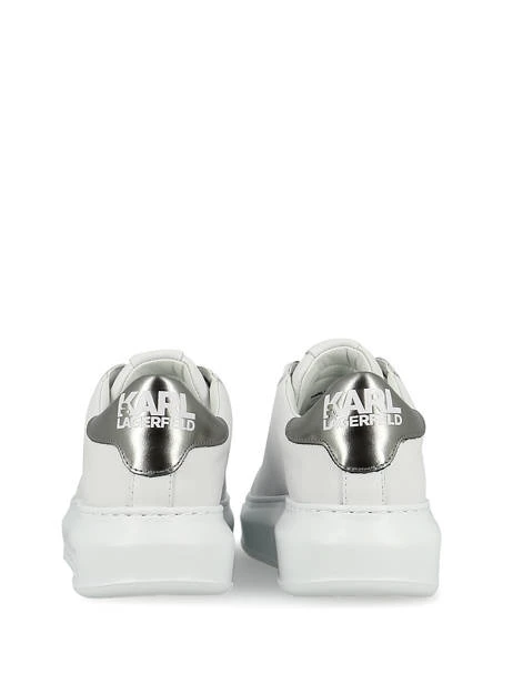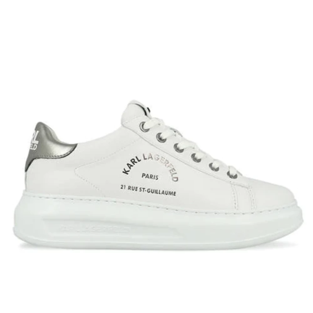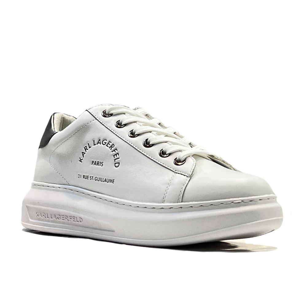 The metallic sheen on the iconic Maison KARL logo is reflected on the heel counter, framing this minimalist Nappa leather sneaker.