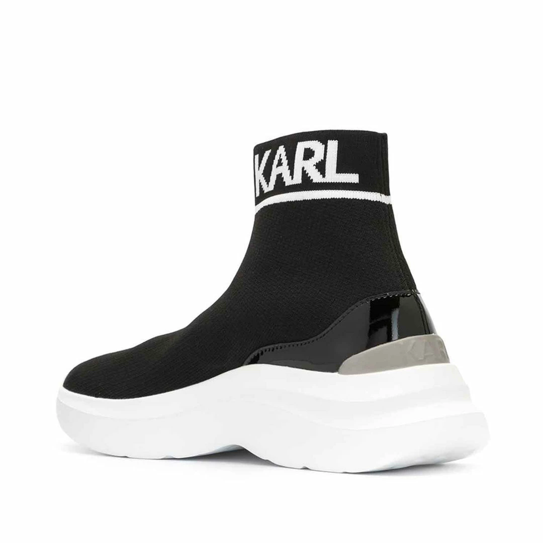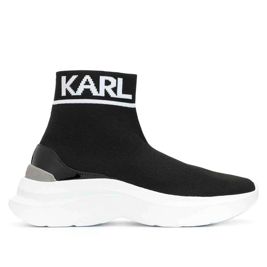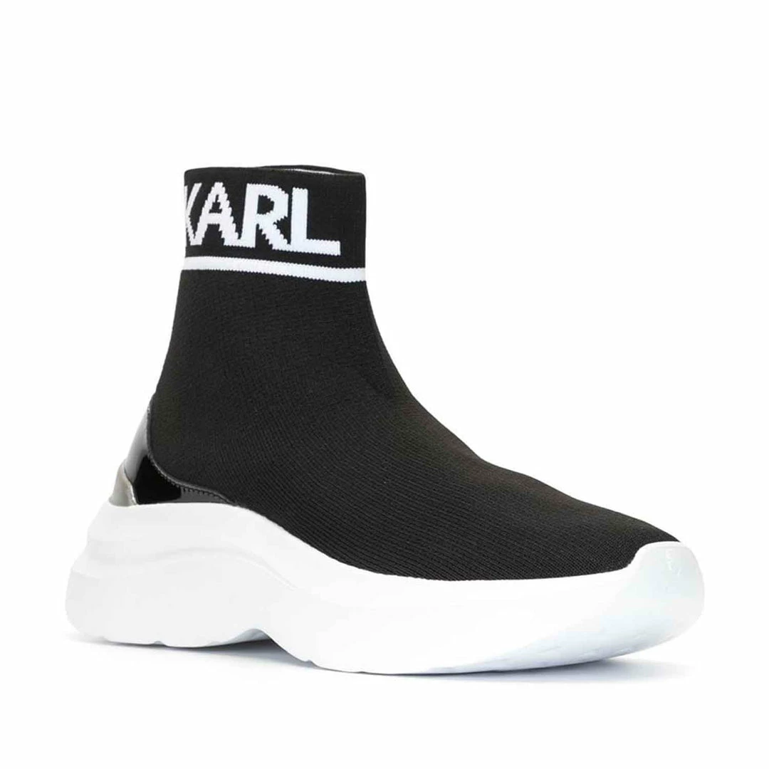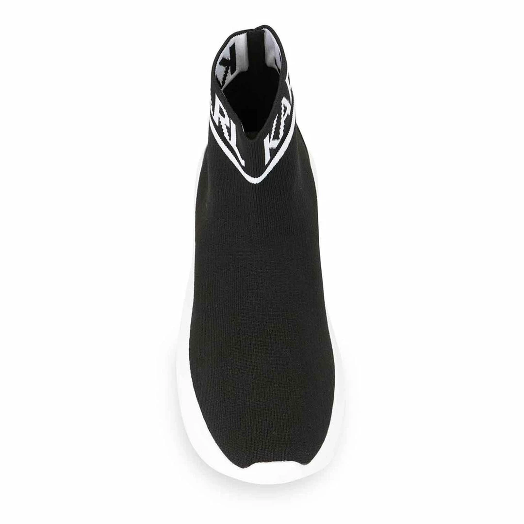 Black leather Skyline sneakers from Karl Lagerfeld featuring a printed logo, an ankle length, a sport sock style, a round toe and a white rubber sole.