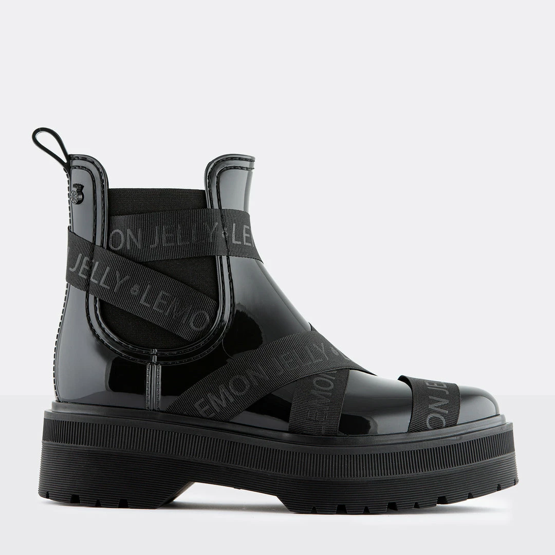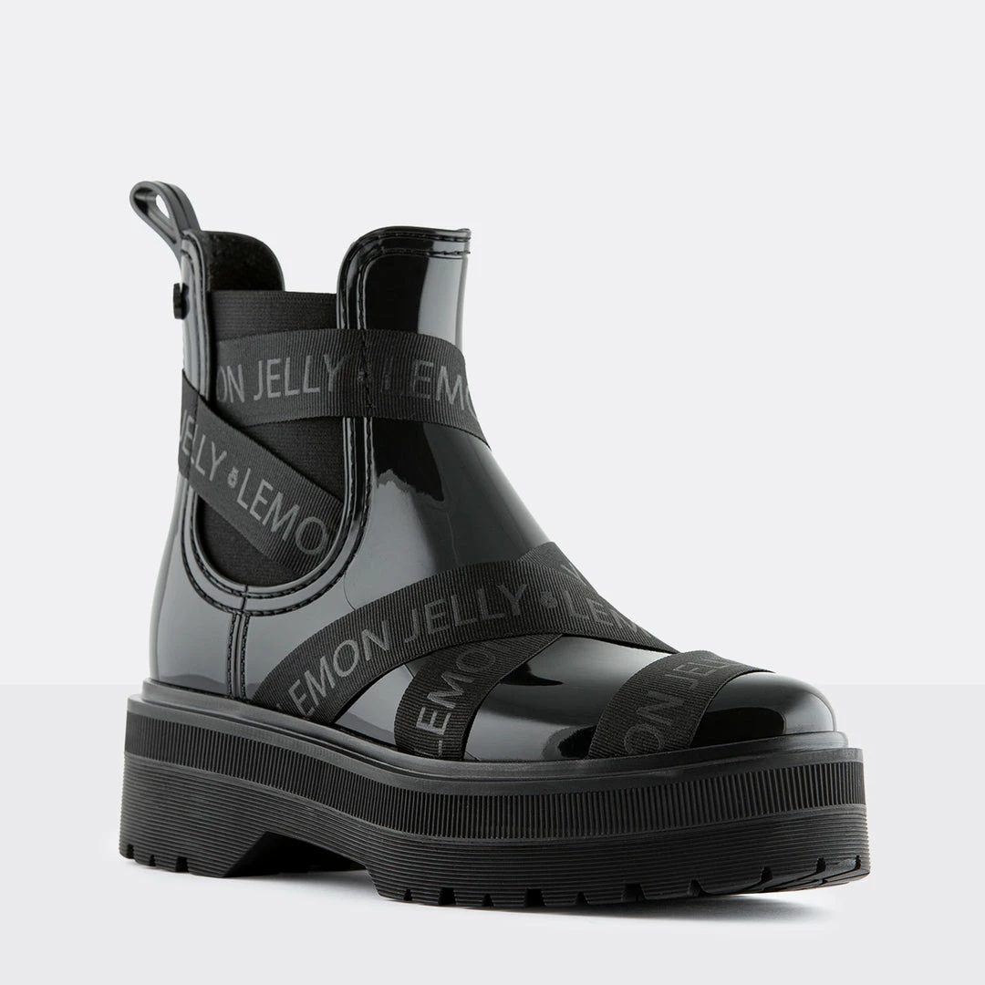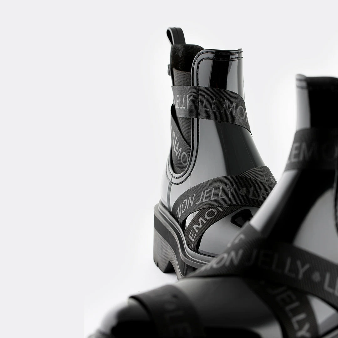 Irresistibly strong, in a discreet but impressive all-black version, these vegan woman’s boots are a combination of a platform-soled rain boot and Lemon Jelly statement straps to wrap the urban look.Â