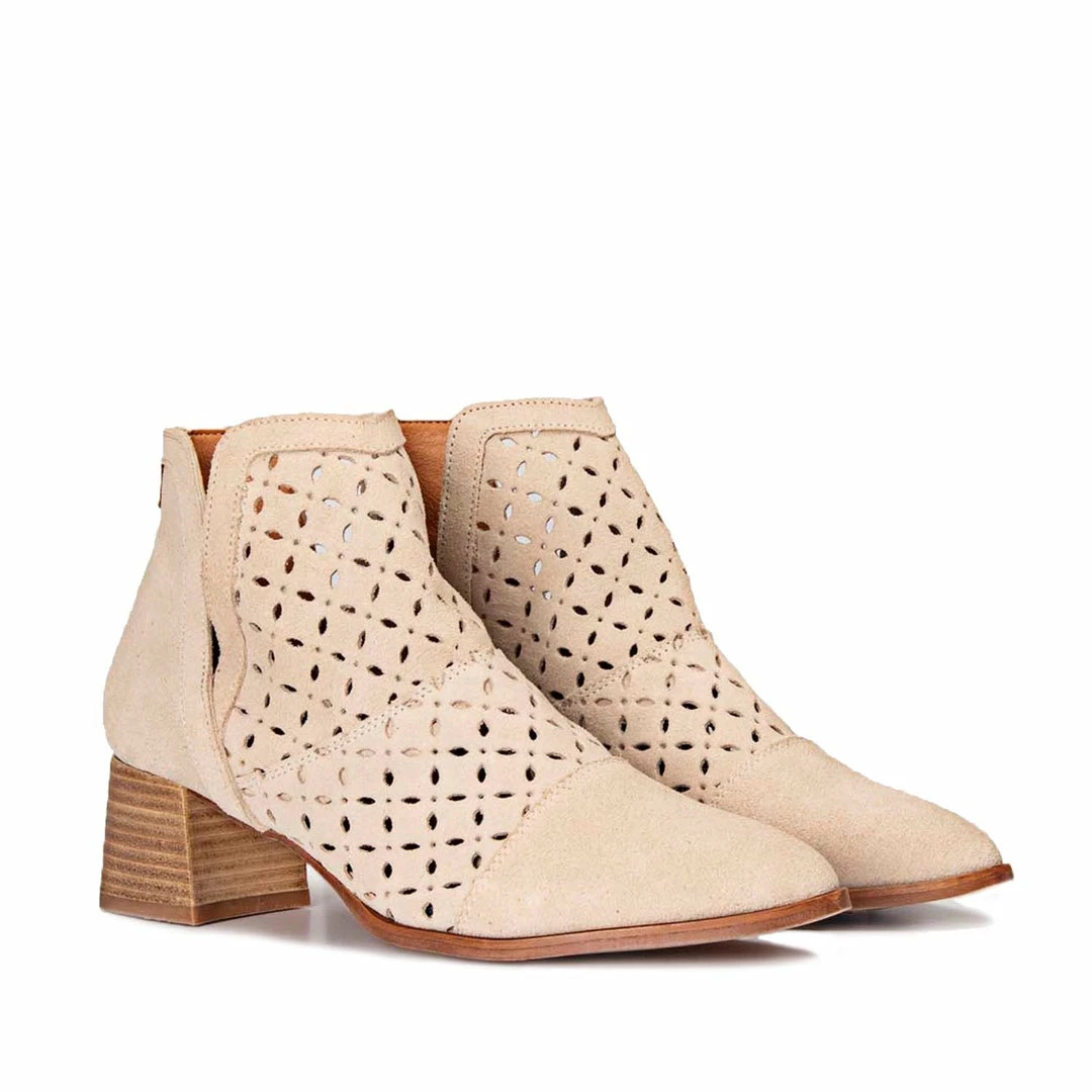 Low, wide-heeled ankle boots are making a comeback this spring. Made of chopped suede material giving it a boho chic touch. Perfect for your halftime looks. COMPOSITION: