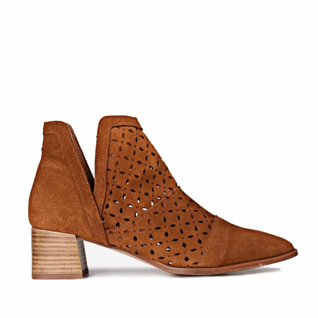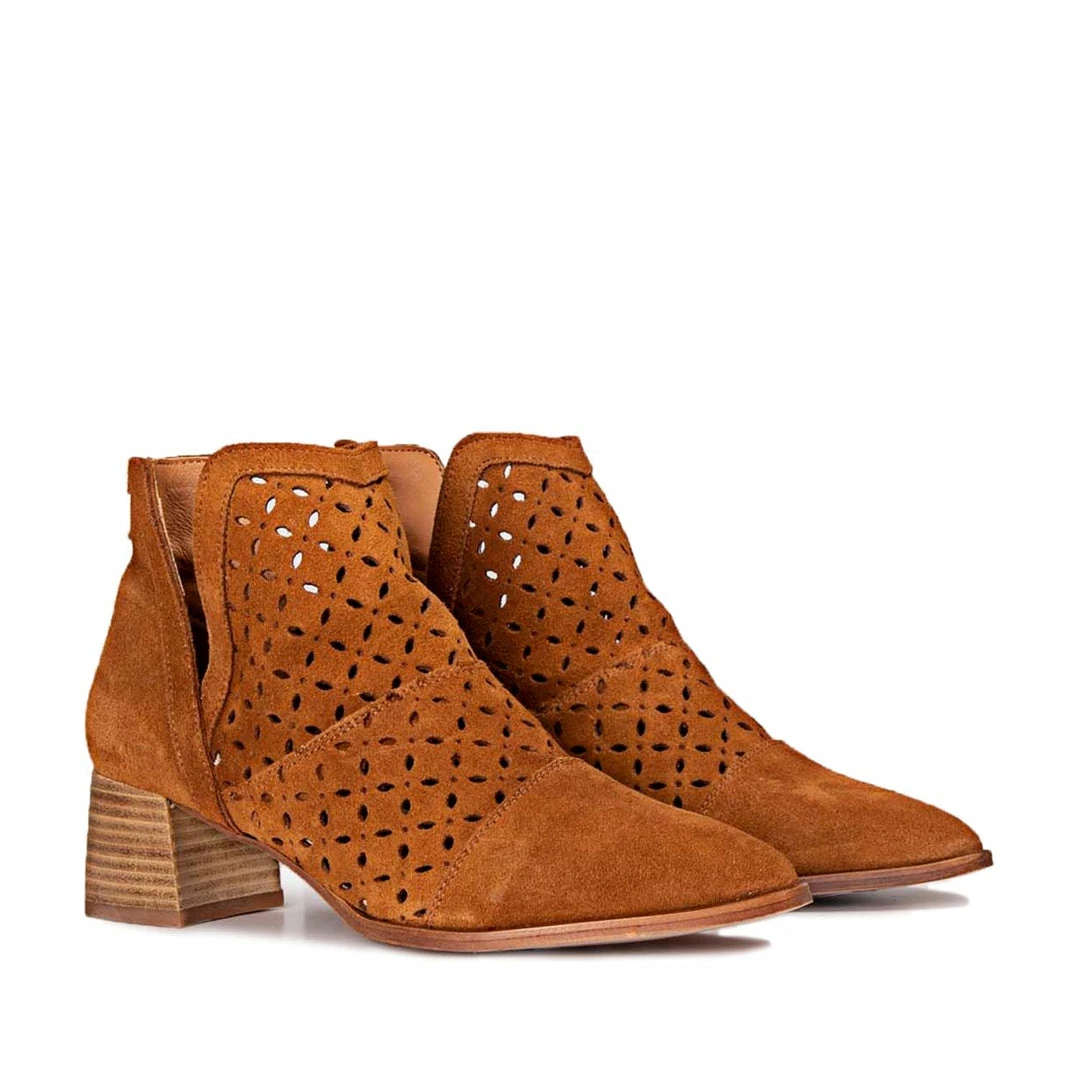 Low, wide-heeled ankle boots are making a comeback this spring. Made of chopped suede material giving it a boho chic touch. Perfect for your halftime looks. COMPOSITION:
