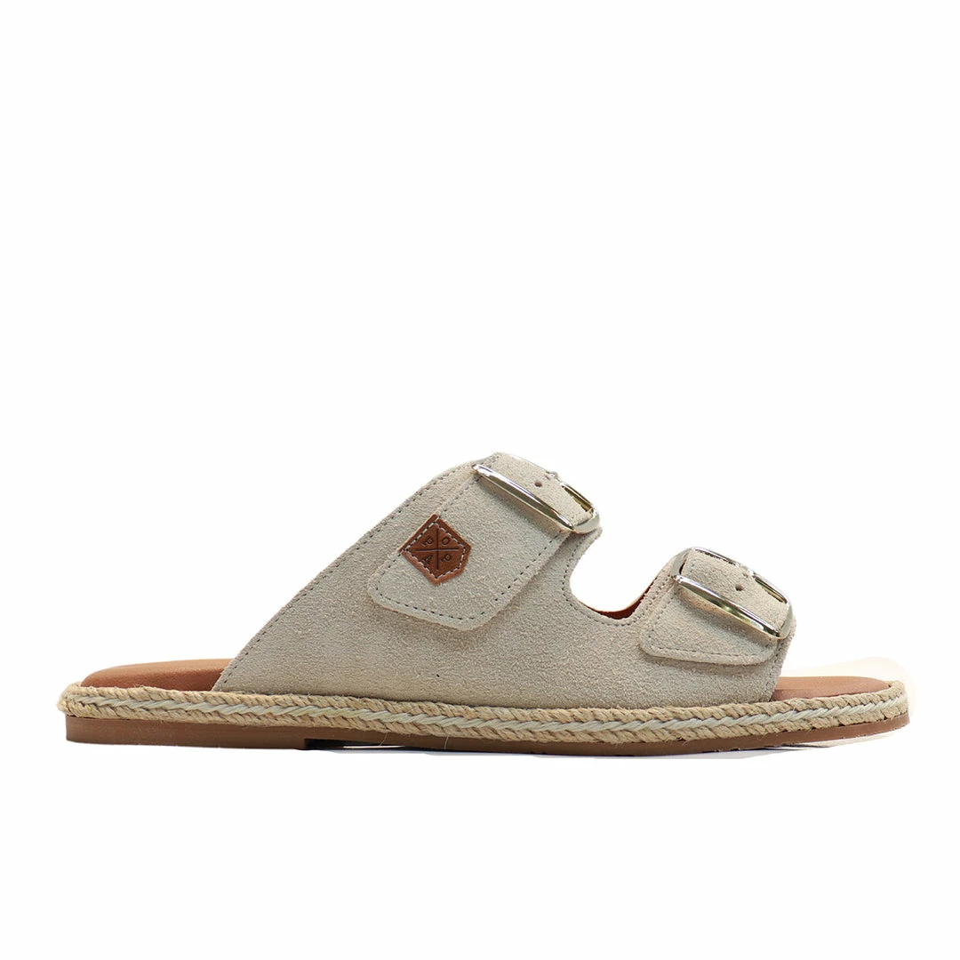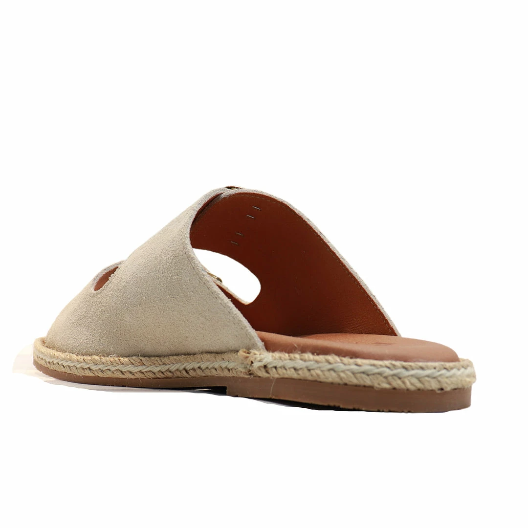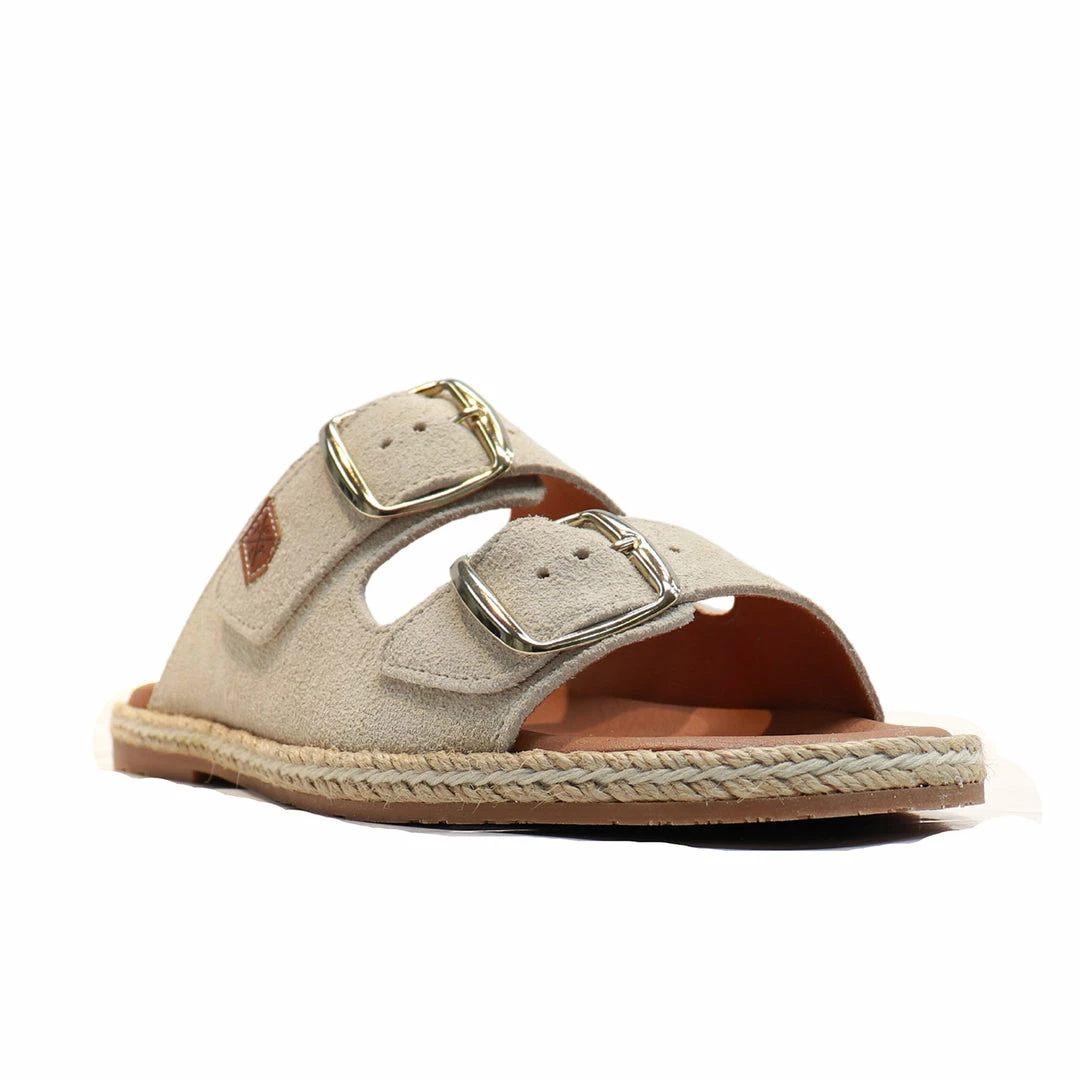 Bio mule with double buckle, in beige suede. Leather interior, exterior and insole