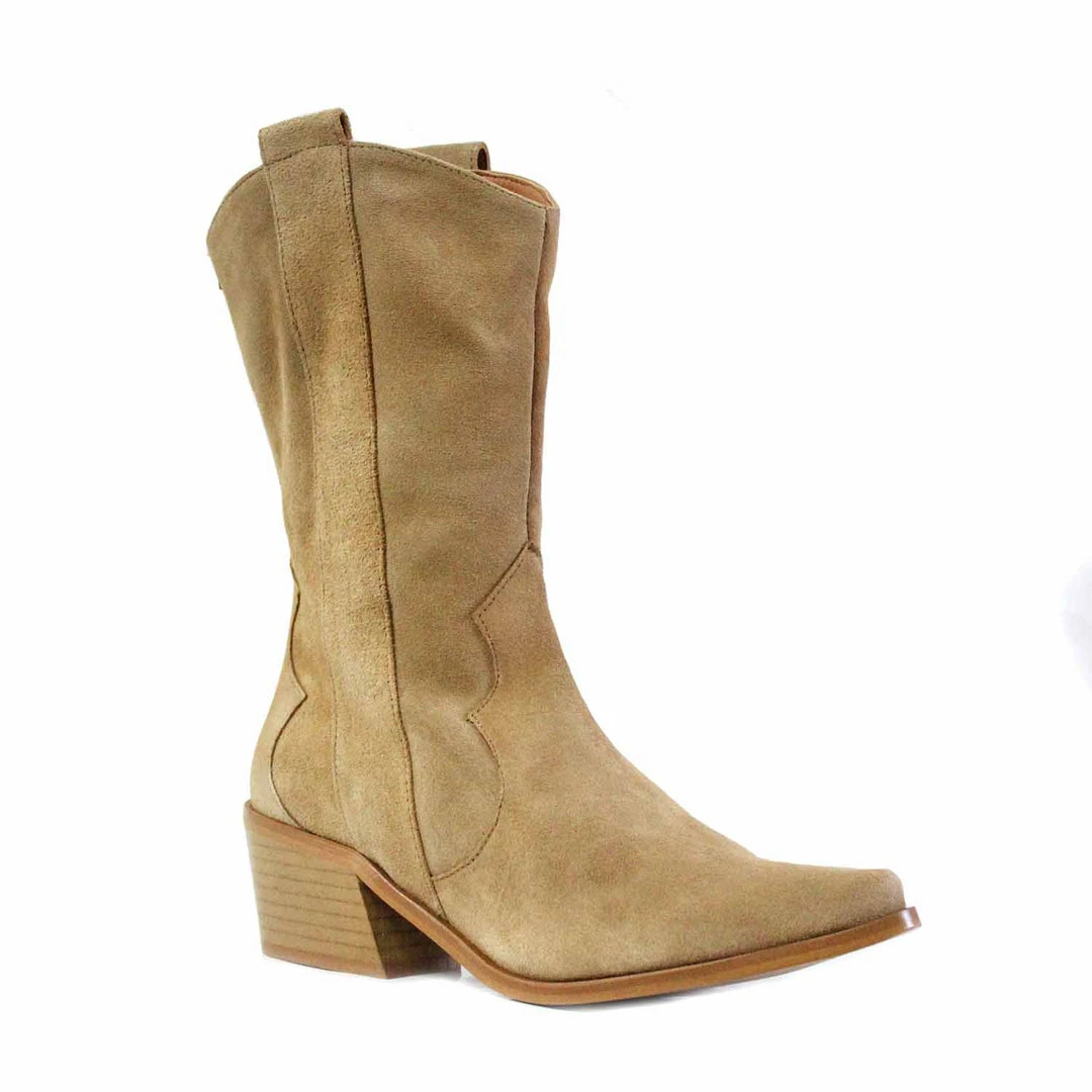 Marina model boot, cowboy style for women, all in beige split leather. Heel in wood color with height 5 cm. Shaft height 26 cm. Women's cowboy style boots from the New Spring / Summer 2021 Collection.| Size | 36, 37, 38, 39, 40, 41 |