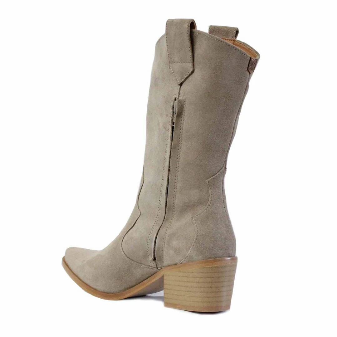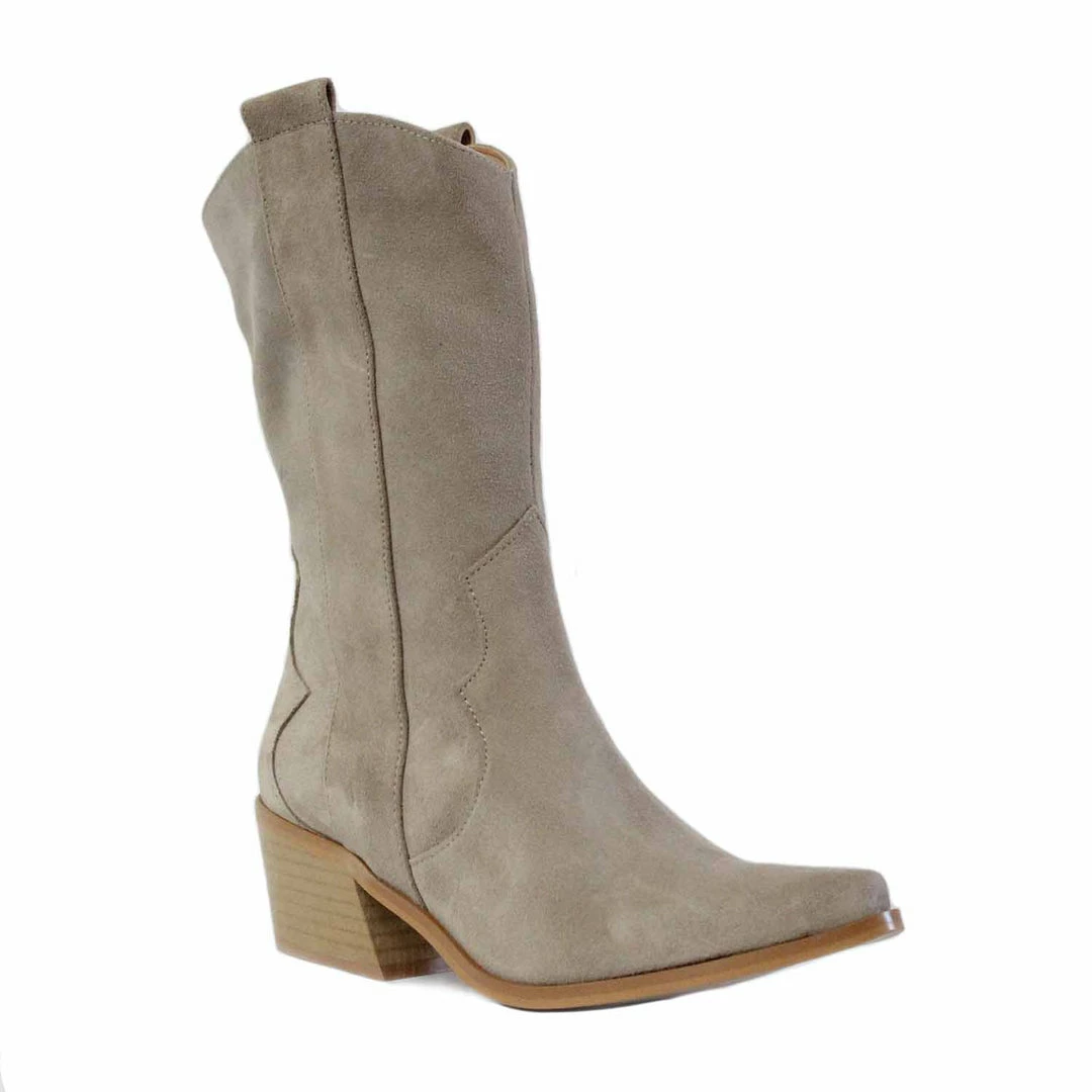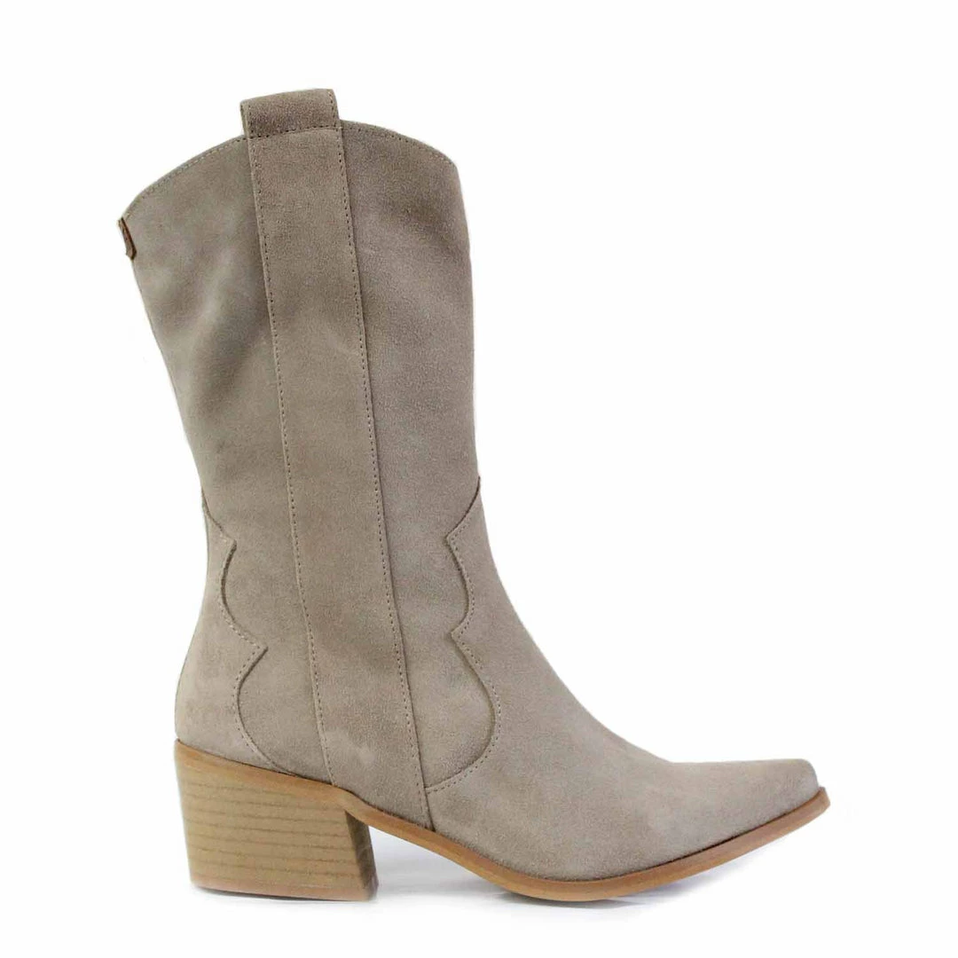 Marina model boot, cowboy style for women, all in grey split leather. Heel in wood color with height 5 cm. Shaft height 26 cm. Women's cowboy style boots from the New Spring / Summer 2021 Collection.| Size | 36, 37, 38, 39, 40, 41 |