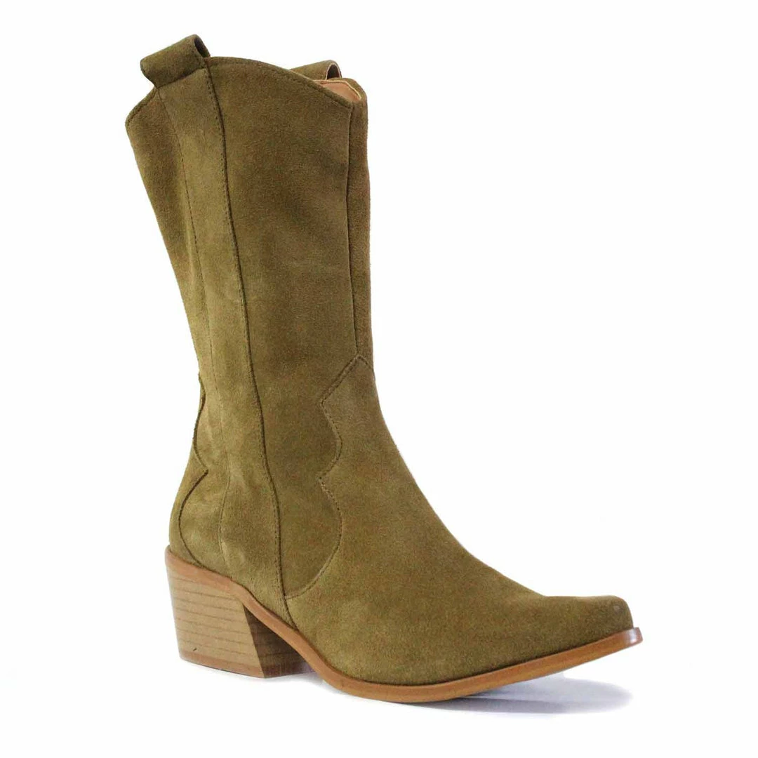 Marina model boot, cowboy style for women, all in khaki split leather. Heel in wood color with height 5 cm. Shaft height 26 cm. Women's cowboy style boots from the New Spring / Summer 2021 Collection.| Size | 36, 37, 38, 39, 40, 41 |