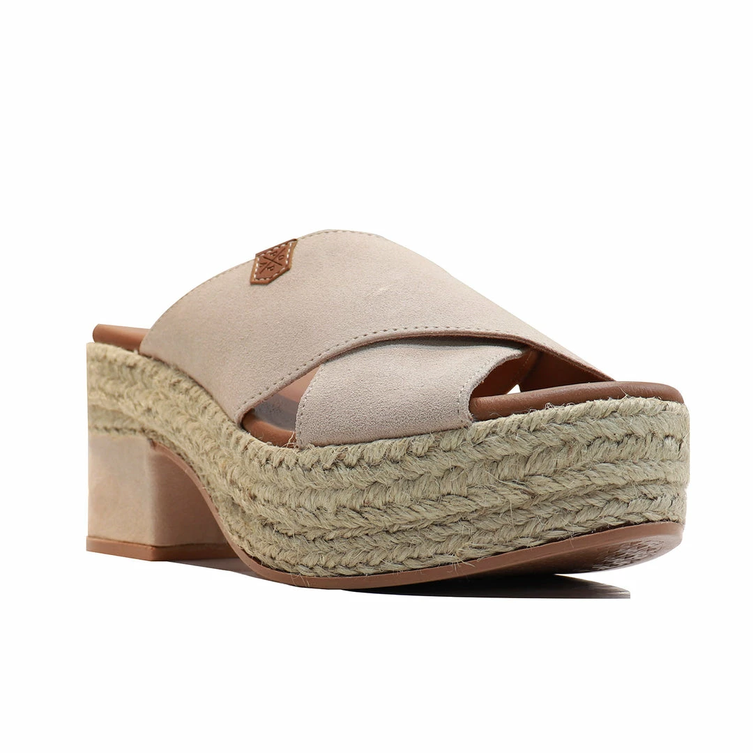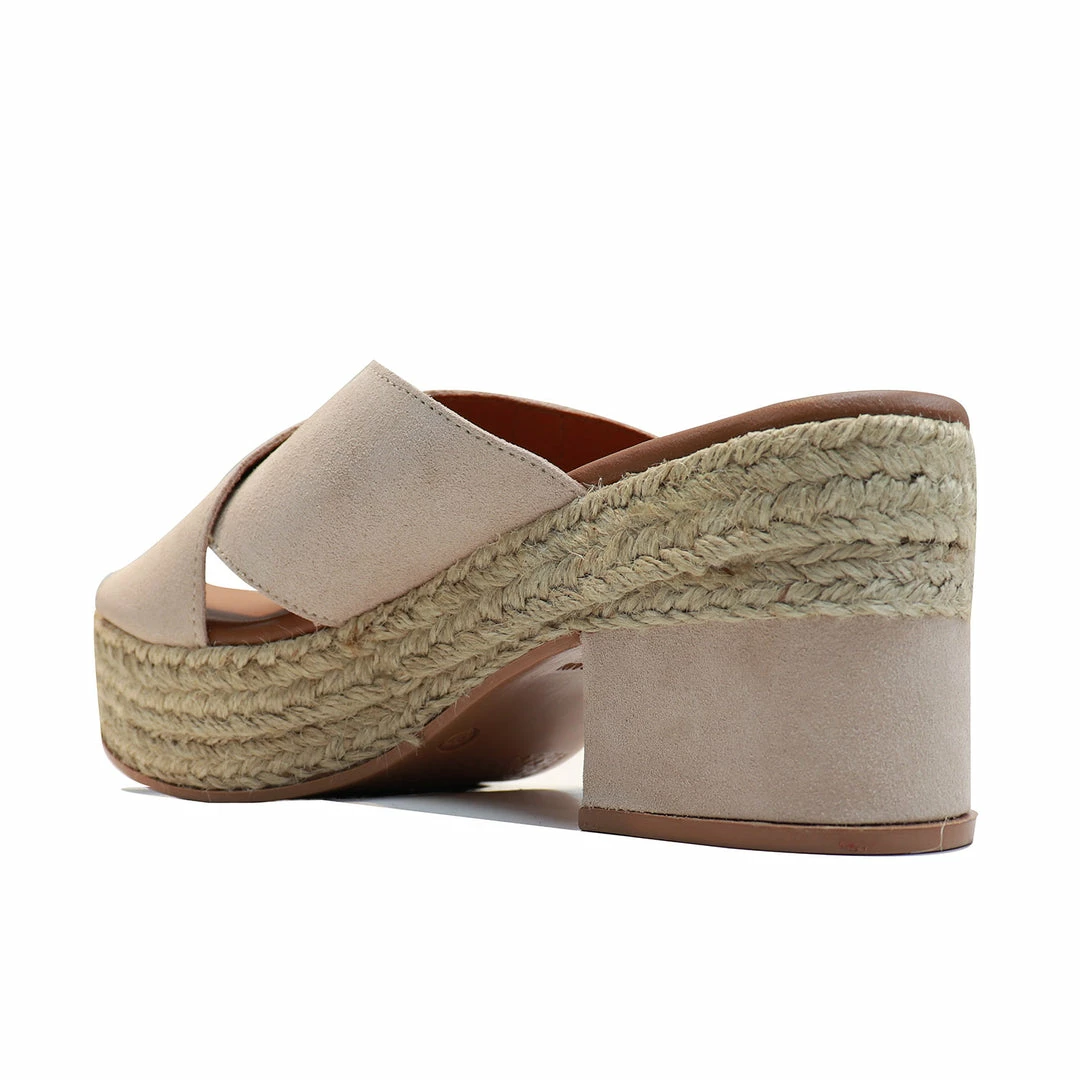 - Arenosa open clogs. Ultra-comfortable, elegant, eye-catching footwear that also has a very special vibe. Its wedge mixes jute material with suede to the tone of its front part or front curve. Padded inner sole. Rubber outsole. Height of 9.5 cm. round toe