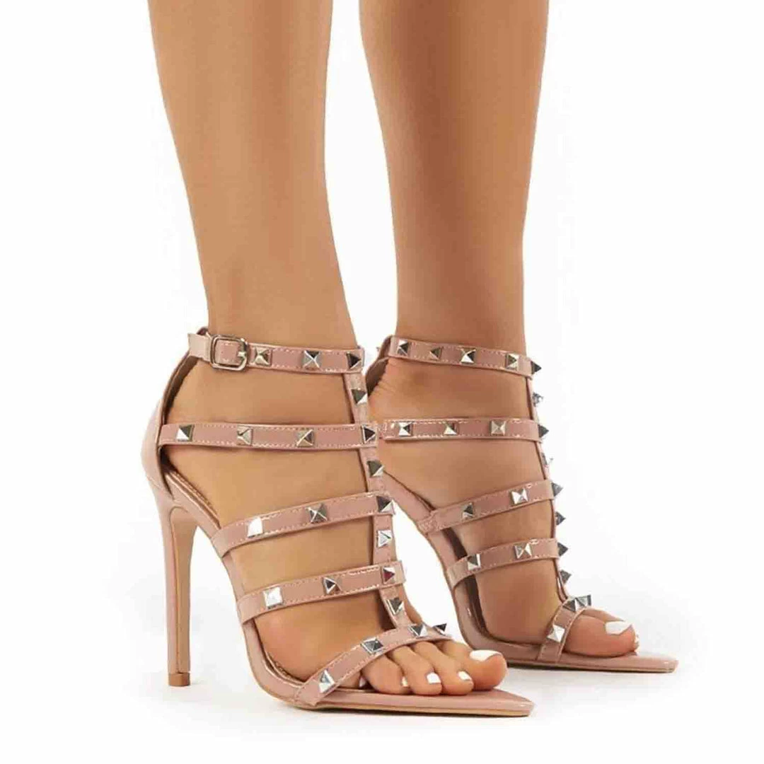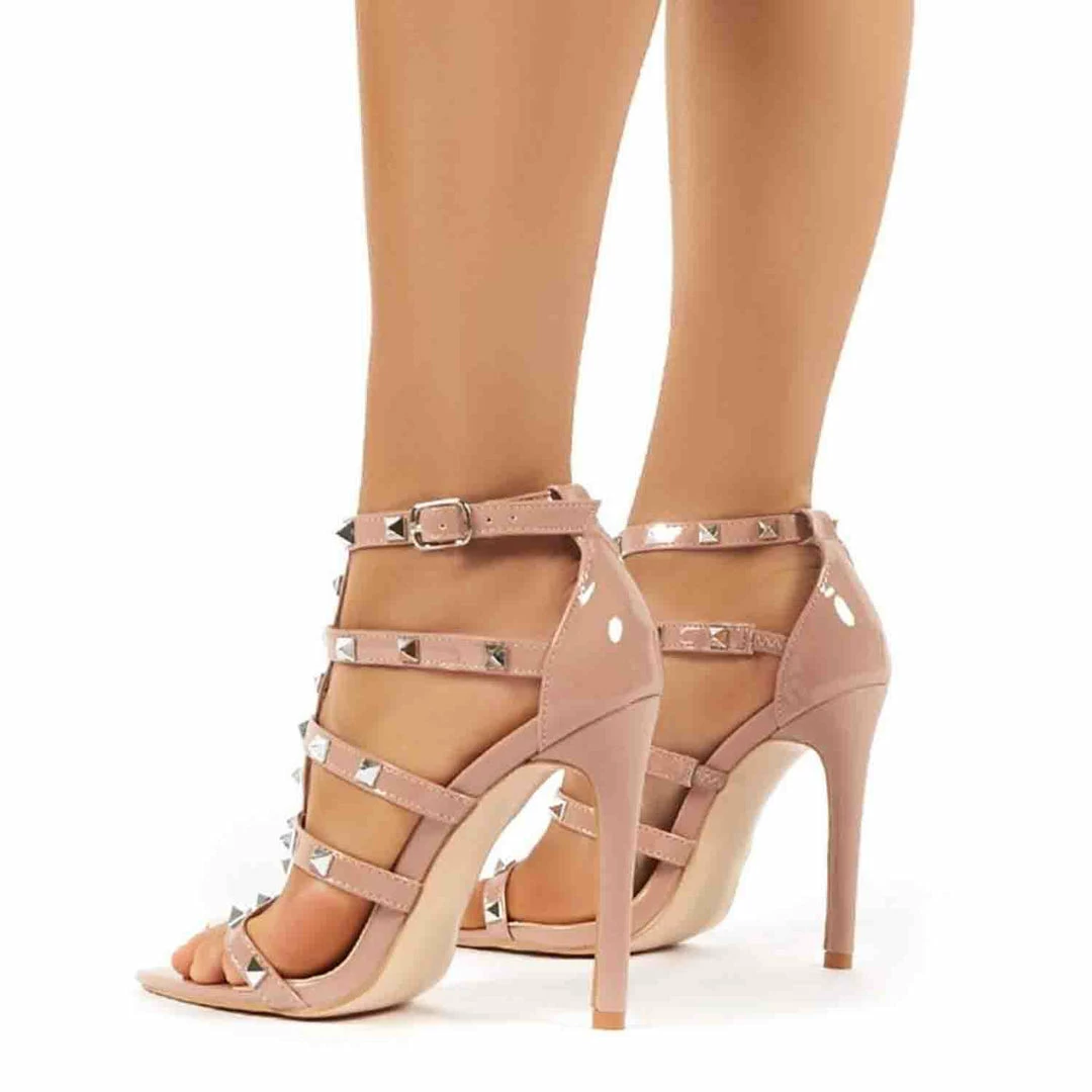 Get that A-list celeb style on lockdown with these studded stilettos. Sara features a pointed toe, strappy upper with silver studded details and a stiletto high heel all in a stunning high shine patent material.