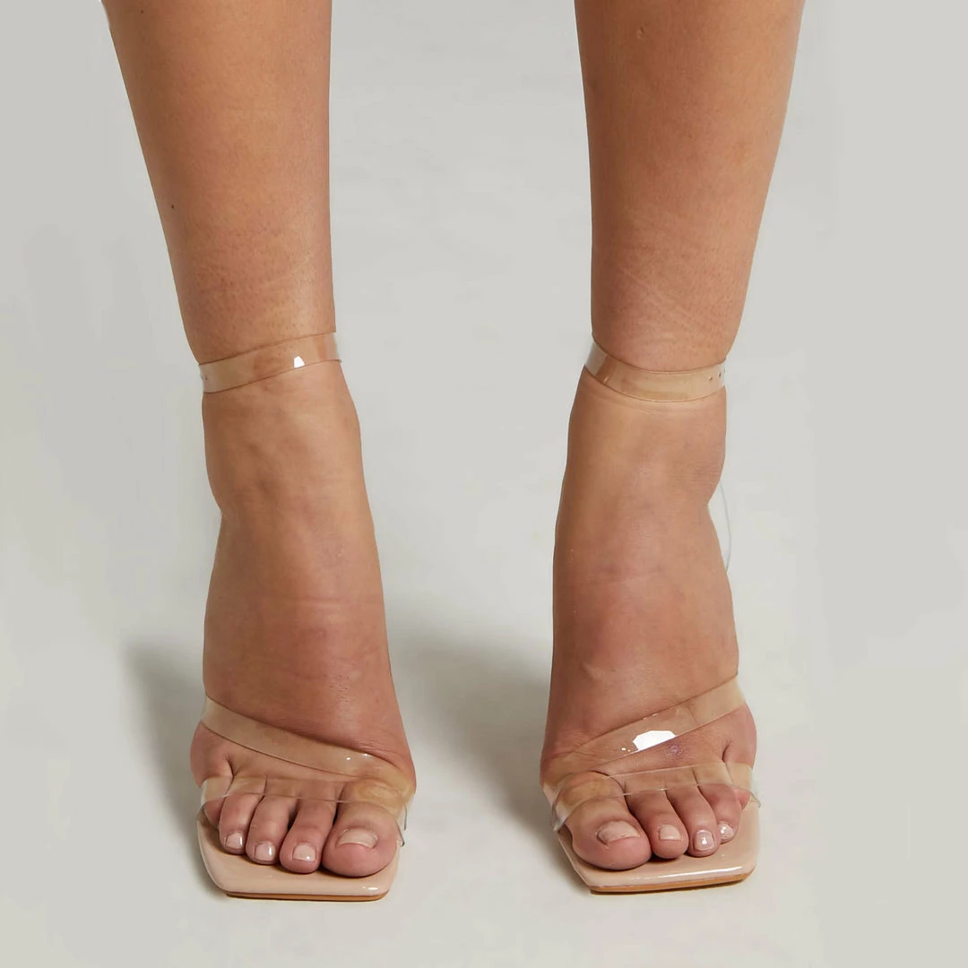 - Adjustable cross back clear ankle strap with buckle fastening