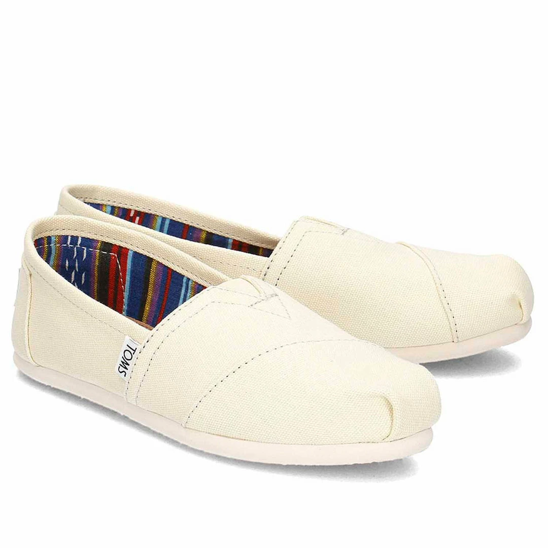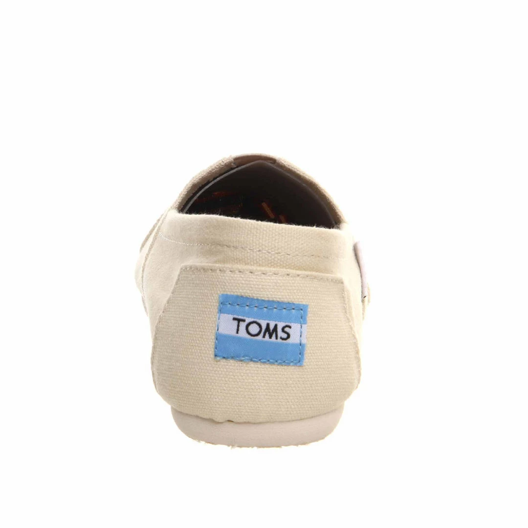 The original Classic Slip On espadrille in a natural coloured canvas with stitched detail, elastic ‘V’ for easy on and off and the blue TOMS logo on the heel.