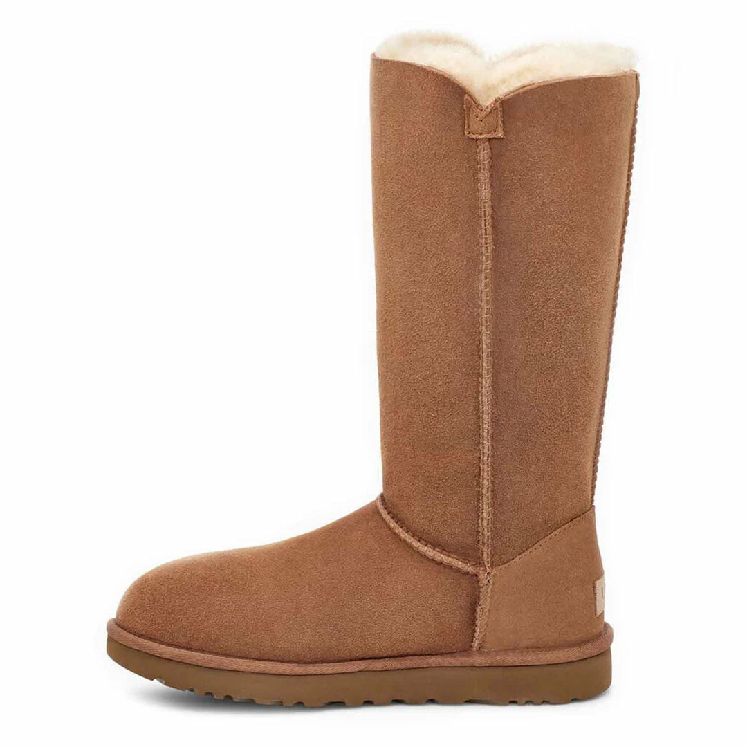 A fresh take on the timeless classic Tall, the Bailey Button boot in chestnut nubuck features triple wooden logo buttons with elastic band closure and signature Twinface sheepskin that can be unbuttoned and cuffed to expose its cosy interior.