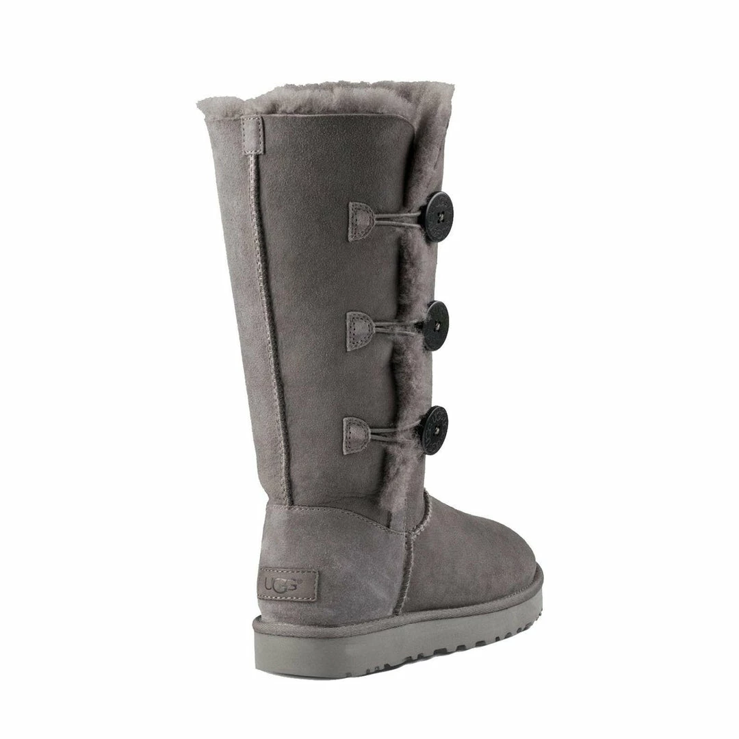 A fresh take on the timeless classic Tall, the Bailey Button boot in grey features triple wooden logo buttons with elastic band closure and signature Twinface sheepskin that can be unbuttoned and cuffed to expose its cosy interior.