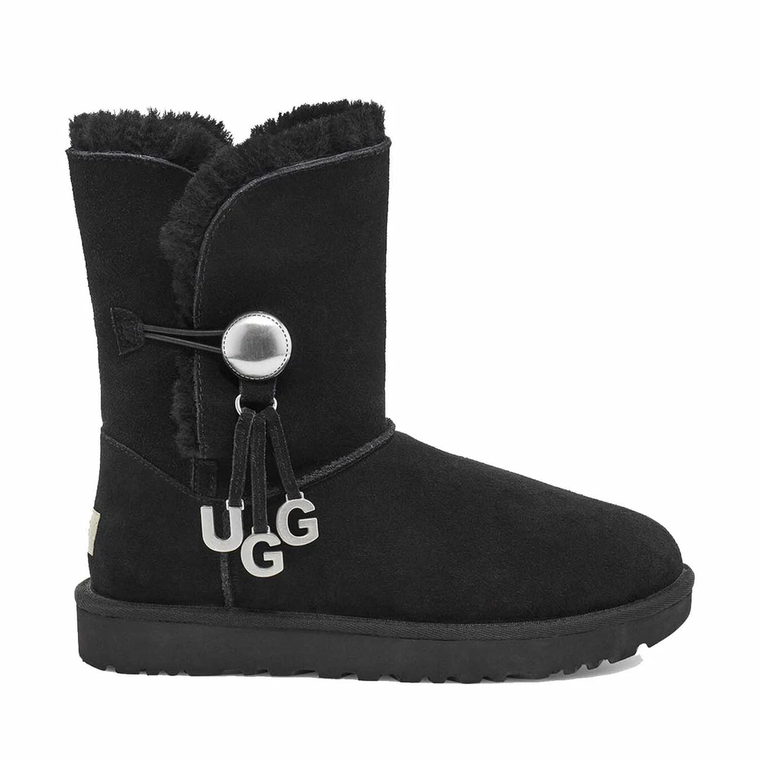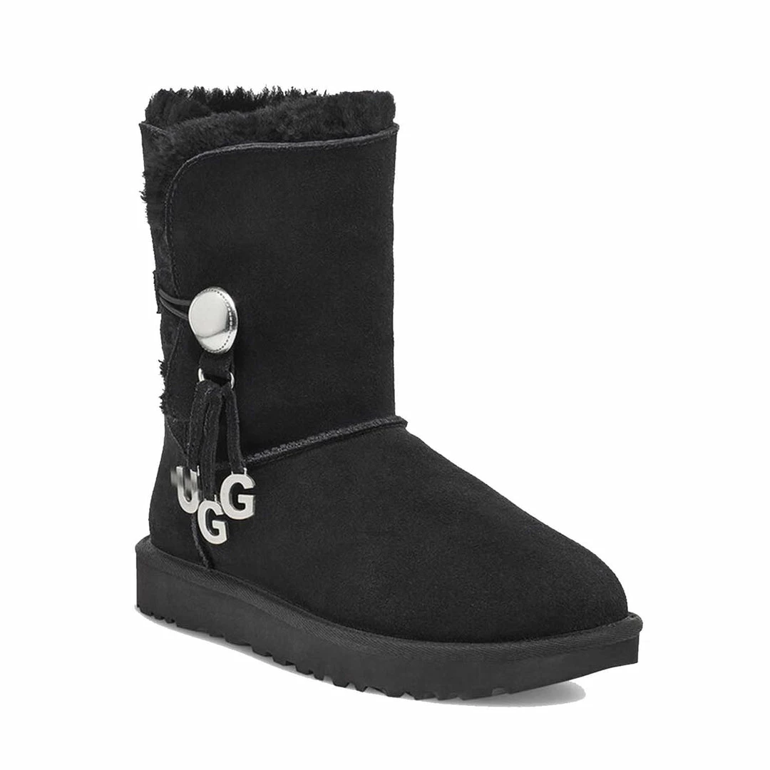 From UGG Australia are the Bailey Button UGG Charms sheepskin boots in Black. In the classic UGG Australia style, the sheepskin boots are sure to keep your feet cosy and warm. Featuring a metallic button and three leather strips with metallic letters charm, which gives the design a funky update.