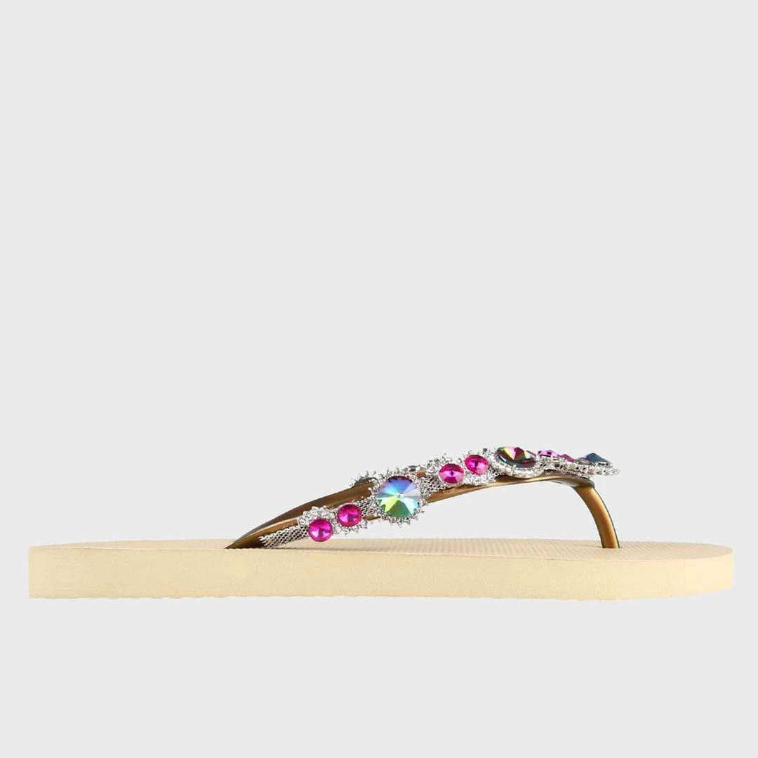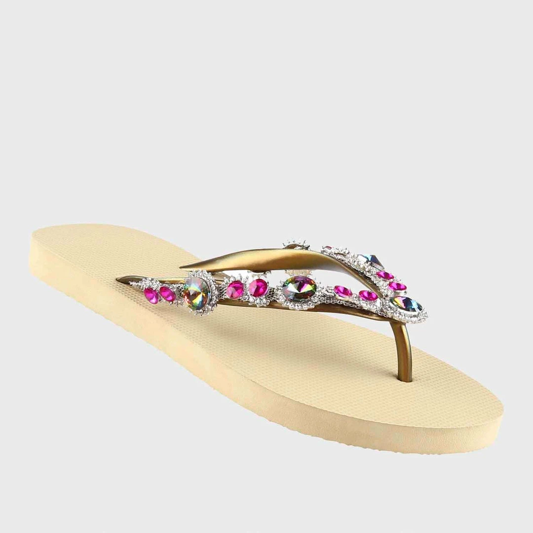 Featuring an open toe, a slip-on style and a flat rubber sole.Rubber – PVC – Stones Platform height: 1,5cmThe V (strap): Made in ChinaSole: Made in Brazil