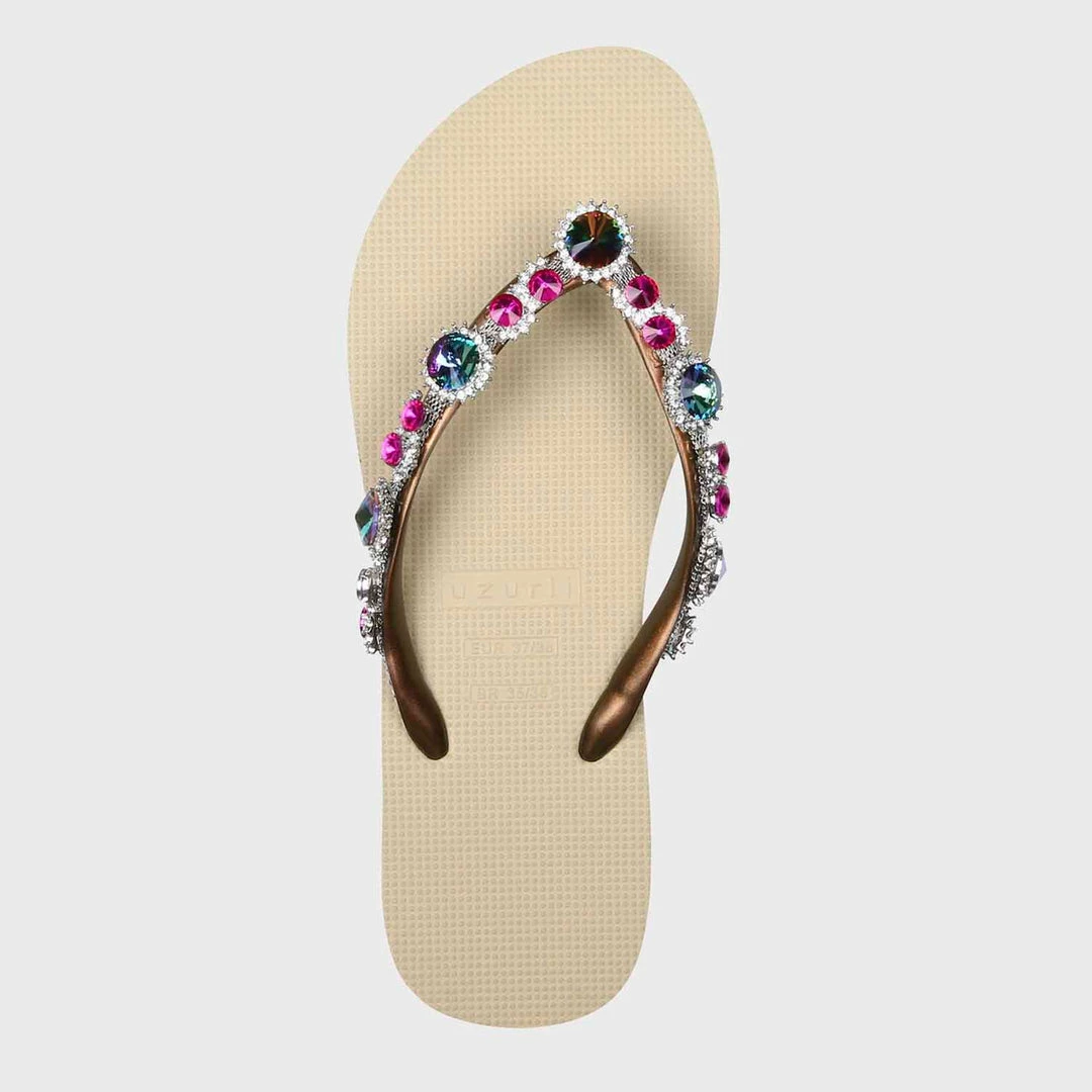 Playing around with gems in countless shapes, colors, and textures is what make our designs today. The V are detailed with the signature Uzurii logo across the straps.